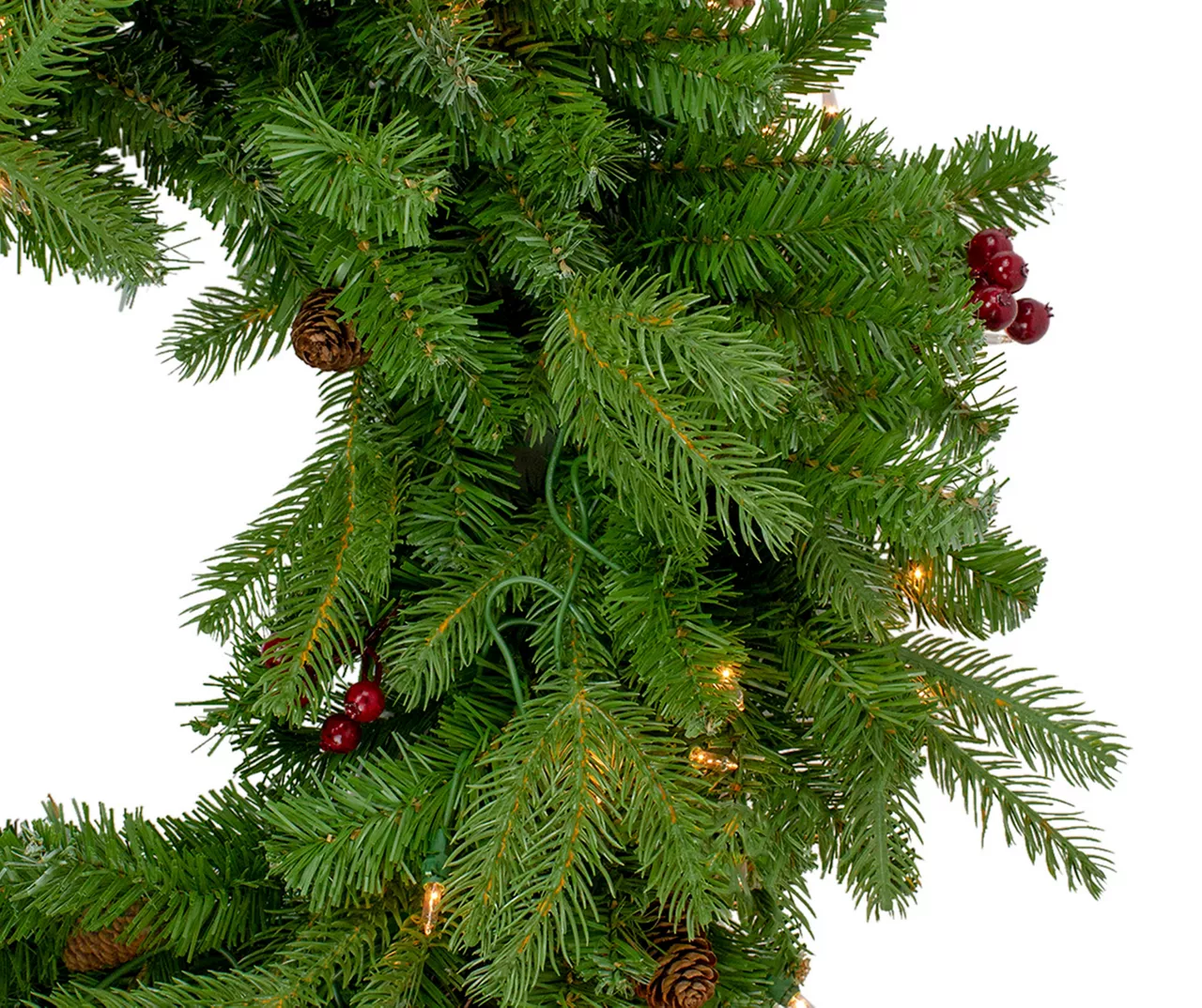 Create a wonderful holiday look in your home using this festive wreath. A mixture of pine branches are filled with seasonal berries and pinecones as it illuminates from classic mini lights. It’s a beautiful addition to your seasonal decorations.