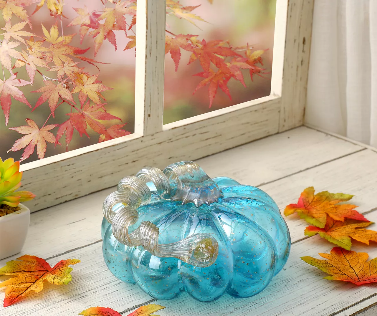 Adorn your home in stunning fall design using this glass pumpkin. Its hand-blow ribbed shape features a beautiful blue look with speckles of gold. Topped with a curly textured stem, it’s a marvelous addition to a mantel, table or shelf.