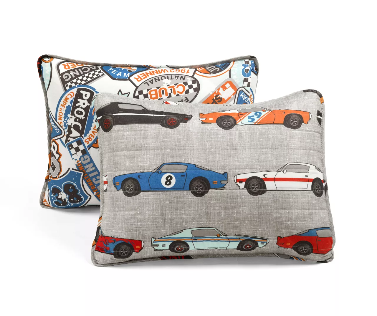 - Quilt front features a race car motif and reverse side features a checkerboard pattern