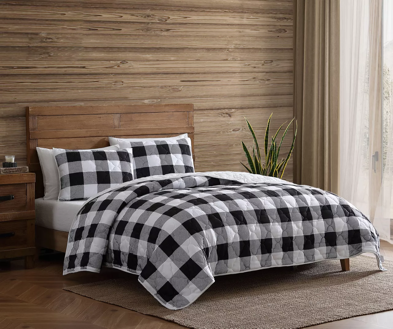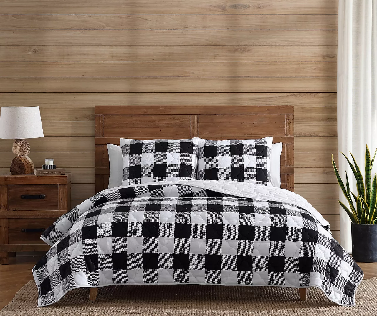 Enjoy cozy warmth with seasonal charm when you add this lovely flannel quilt set to a master or guest bedroom. Arabesque quilting with a buffalo check pattern in white and black gives your sleep space a classic wintry feel.