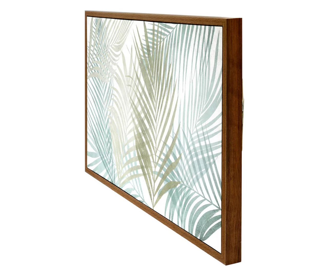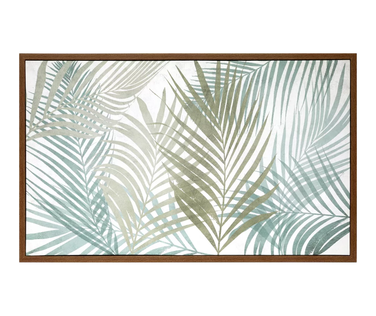 Accent your home in the tropical artistry of this art canvas. Botanical leaves are splayed across a white background in varying muted shades of green and blue.
