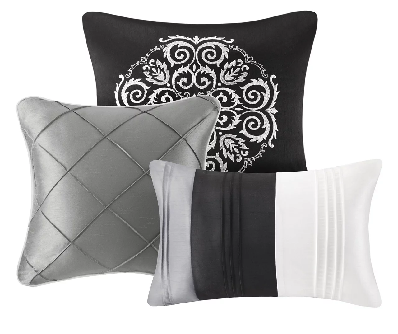 The Burnett comforter set offers a rich traditional update to your bedroom decor. The comforter and matching shams feature lustrous fabric and pintuck details in gray, ivory and black hues to create a stunning traditional look. Two square pillows and an oblong pillow with embroidered and pintucked details add rich textural touches to the top of the bed. A solid black bed skirt provides the finishing to the luxurious comforter set. Hypoallergenic filling in the comforter and decorative pillows provides exceptional warmth and comfort. Great for year-round use, this set brings a gorgeous and sophisticated look to your bedroom and is machine washable for easy care.