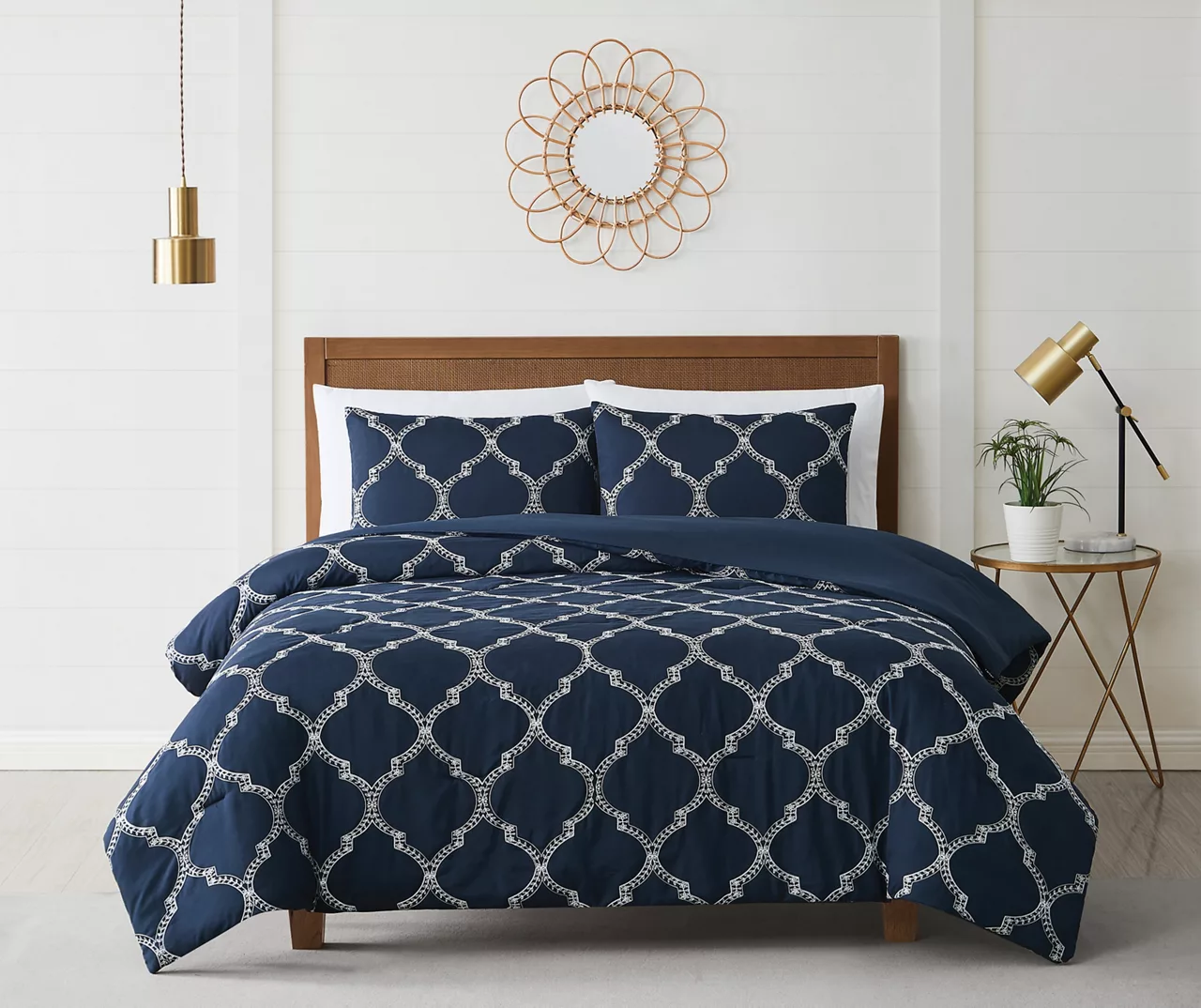 Refresh your sleep space with the modern sophistication of this cozy comforter set featuring an embroidered quatrefoil design in a rich navy and white palette that’s as versatile as it is elegant.