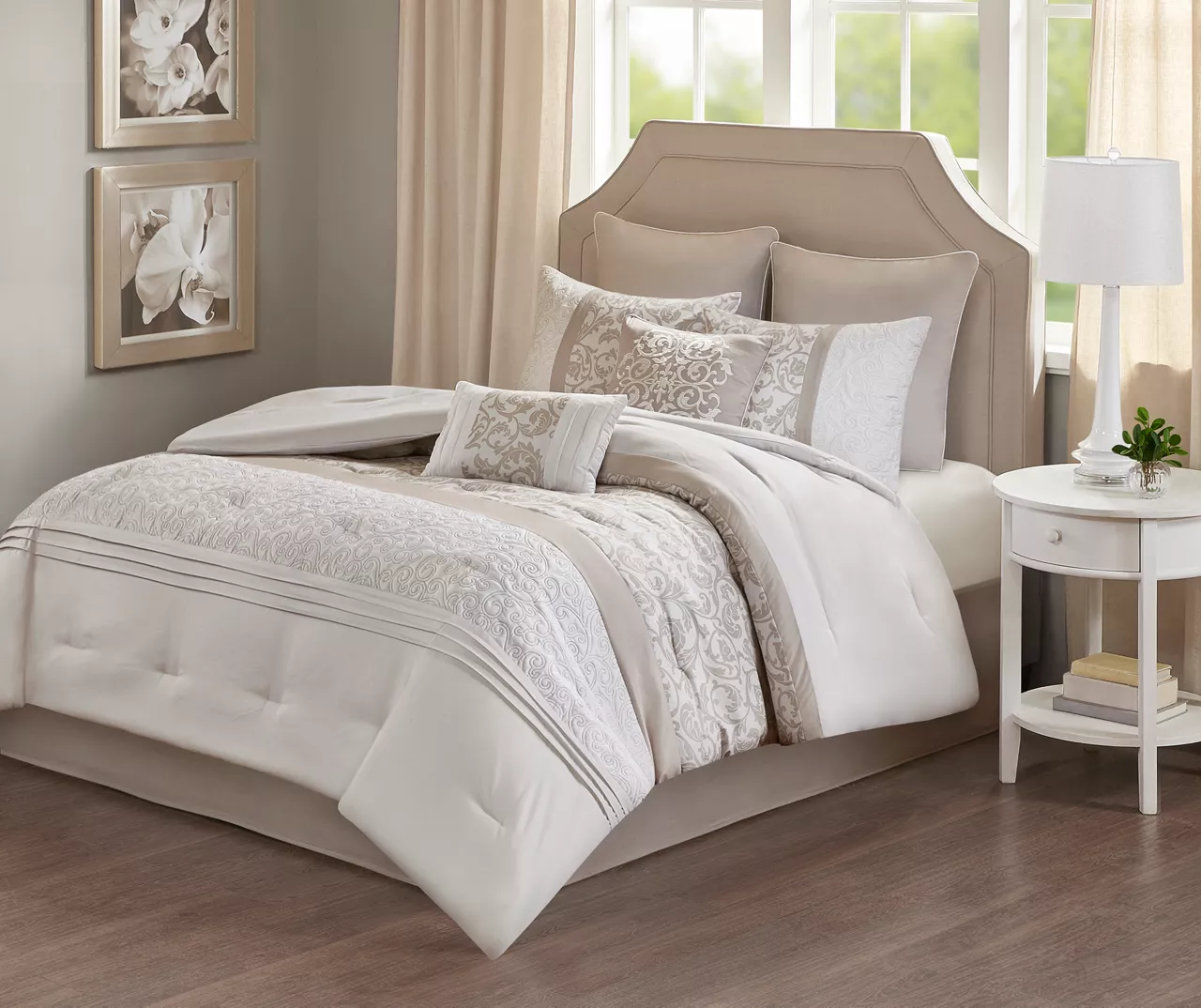 - Includes comforter, bed skirt, 2 – shams, 2 – euro shams and 2 – decorative pillows
