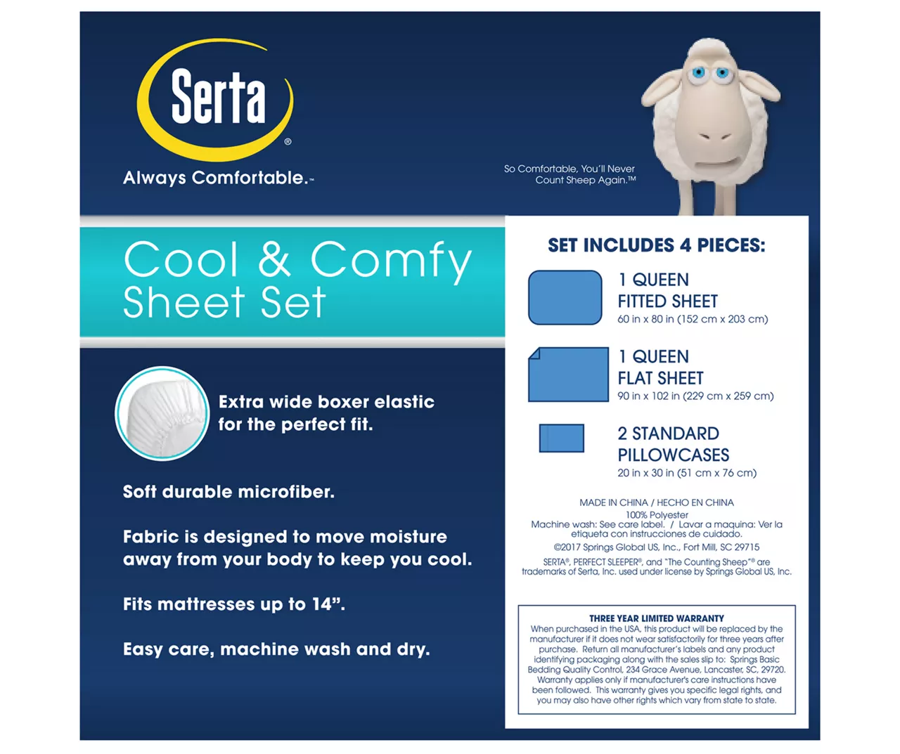 - Includes 1 – flat sheet, 1 – fitted sheet and 2 – standard pillowcases