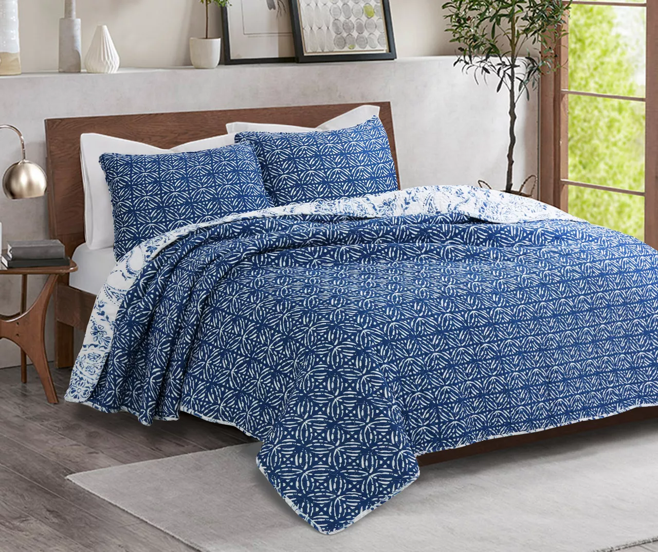 An elegant floral and paisley print in deep blue and crisp white hues brings a touch of garden elegance to your sleep space, while the breathable cotton construction keeps you cozy and comfy through the night. The quilt reverses to a floral grid contrast pattern so you can switch up your bedroom style on a whim.
