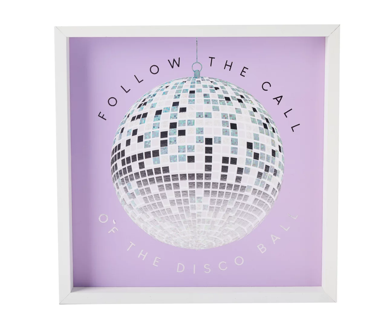 This framed art from Real Living’s Euphoric Expression collection will make any room shine! “Follow the call of the Disco Ball!” This sign is embellished with iridescent white glitter and also includes silver holographic foil on the disco ball.