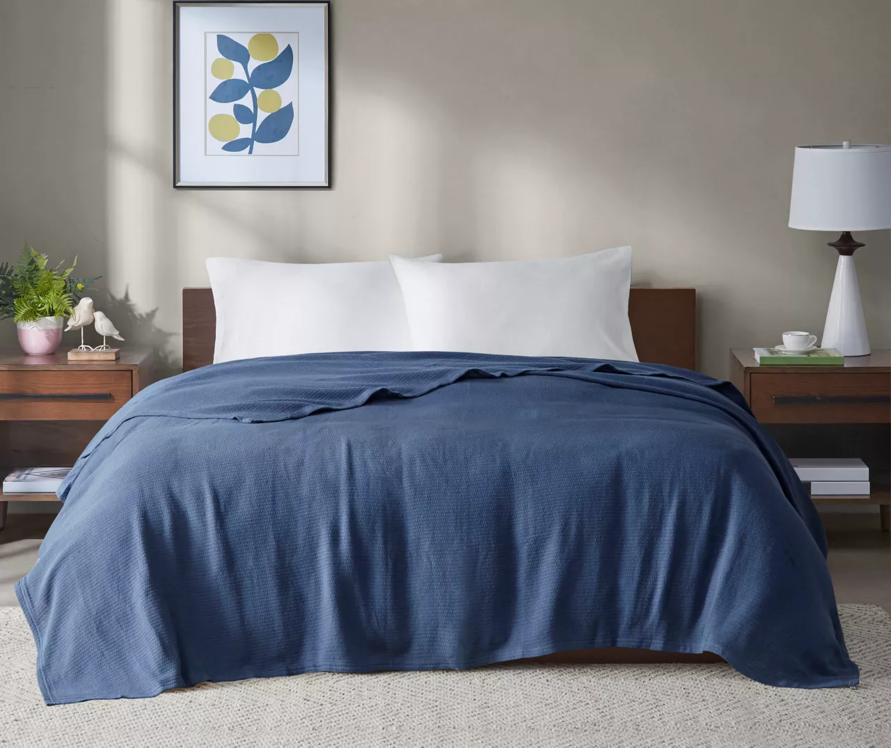 The Freshspun blanket features a charming basketweave textured pattern made from high-quality upland cotton for breathable and cozy coverage that’s perfect for year-round use. It can be used alone on warm nights or layered with other bedding for extra cozy coverage. The solid blue shade is easy to pair with your existing bedroom arrangements whether you opt to use this in a kids’ or master bedroom.