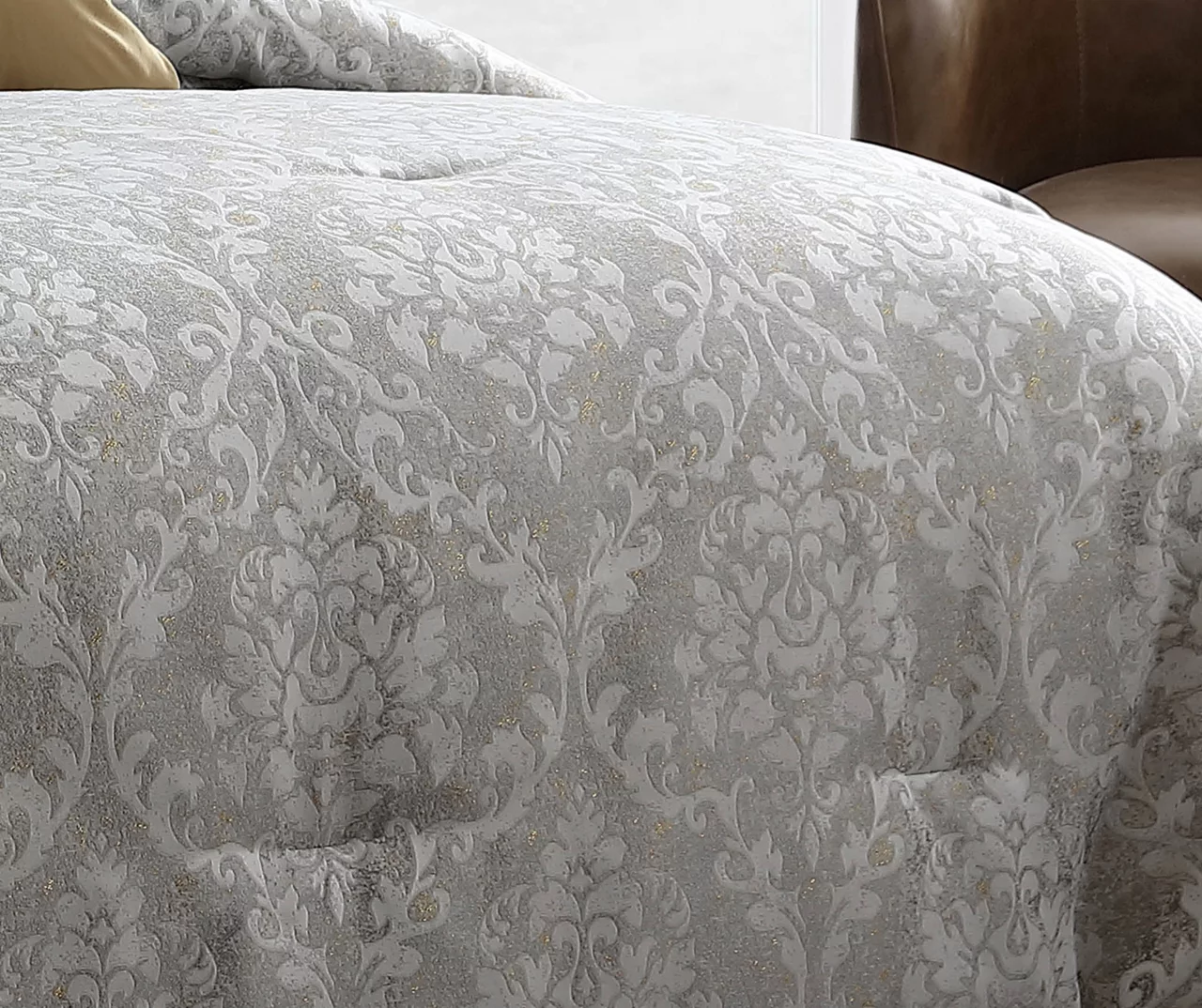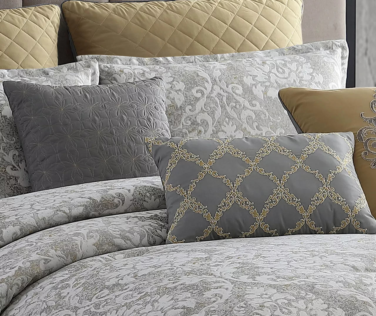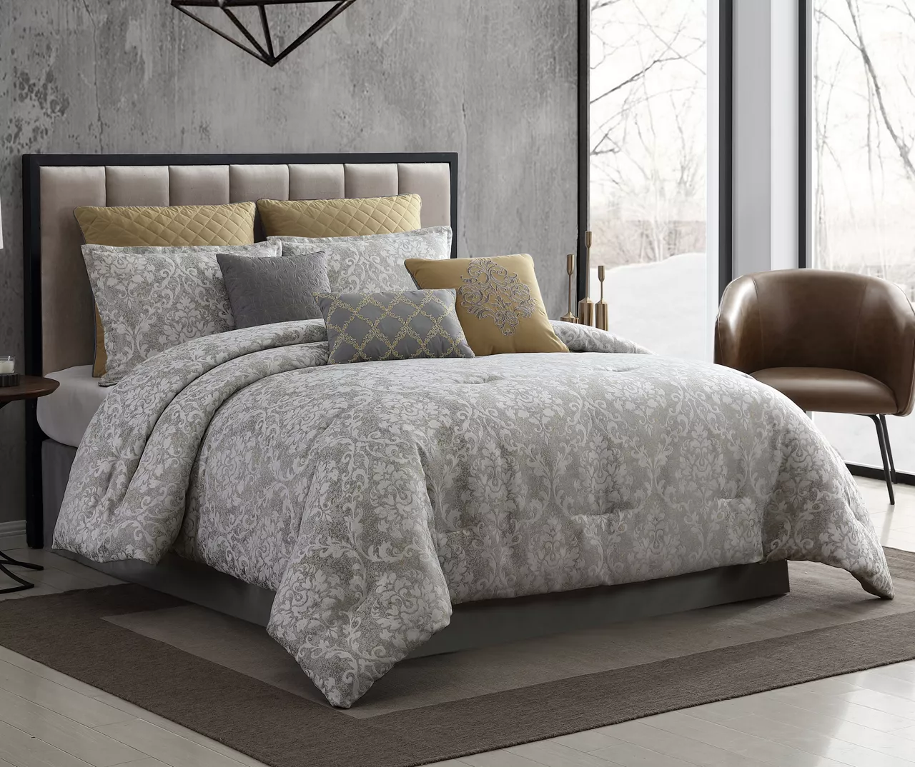 An allover jacquard print featuring damask and medallion designs in shades of gray and gold brings luxe sophistication to this cozy comforter set. Smooth golden Euro shams are trimmed in gray piping, while the decorative pillows feature embroidered and quilted detailing for textured elegance. A matching bedskirt completes the look.