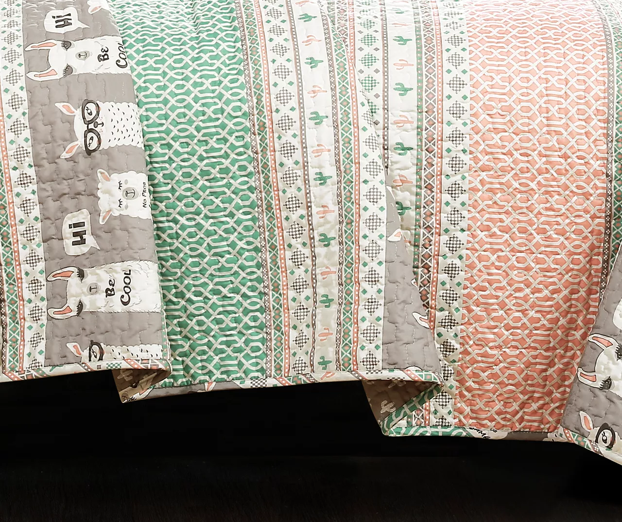 Introduce some lively llama charm into your sleep space with the soft gray and pastel design of this patterned quilt set, complete with a faux fur round pillow for soft texture. Cozy polyester construction delivers warm comfort that lasts through the night.