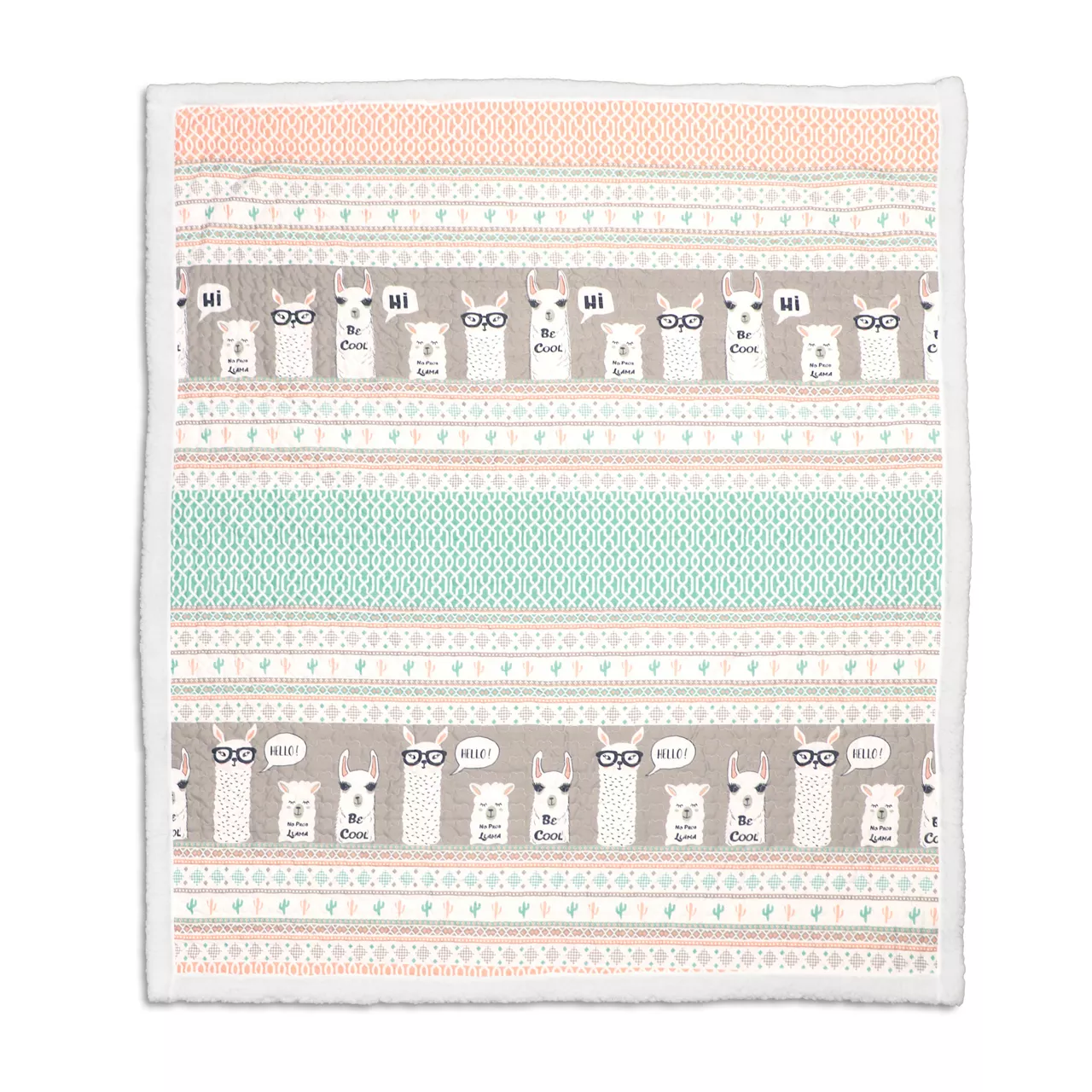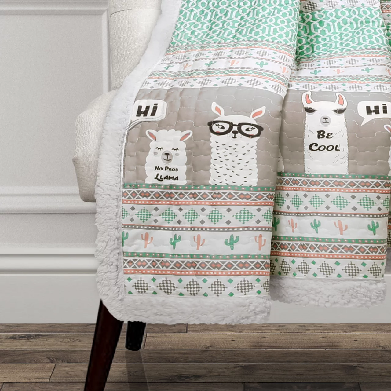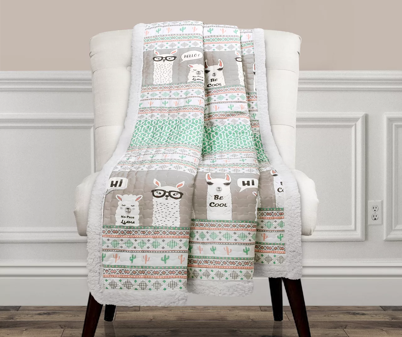 Introduce some lively llama charm into your living space or bedroom with the soft gray and pastel design of this quilted throw, complete with cozy sherpa fabric on the trim and reverse side that delivers warm comfort.