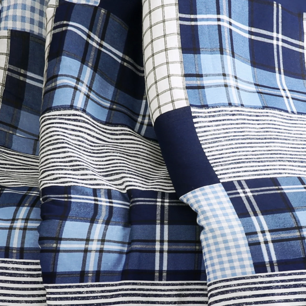- Traditional plaid and windowpane prints in a patchwork design