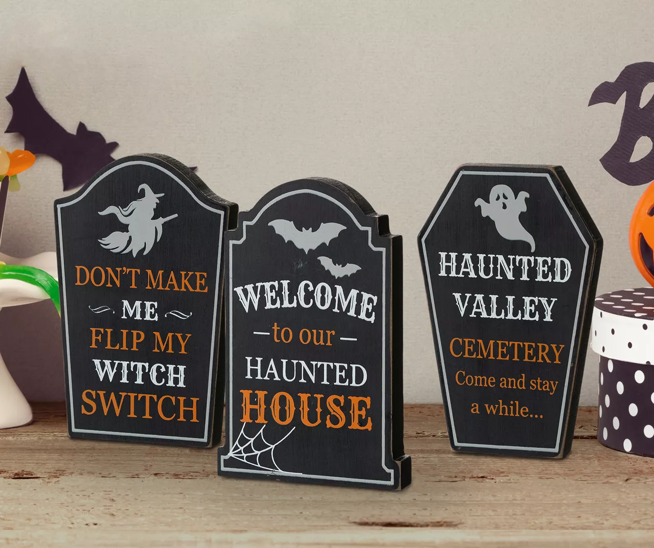 Create a magical Halloween look with this whimsical three-piece table sign set from Glitzhome. Featuring different spooky designs and printed with a variety of Halloween messages, these tombstone shaped table signs are an easy way to get your home feeling creepy for the scariest holiday of the year.