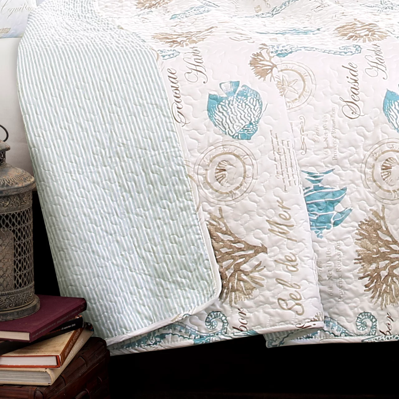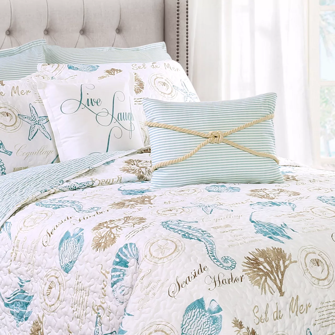 Turn your bedroom into a sea-worthy escape with the coastal charm of this quilt set featuring a print design filled with ocean life and elegant typography. Coordinating decorative pillows complement the look with rope embellishments. Soft polyester keeps you cozy and comfy through the night.