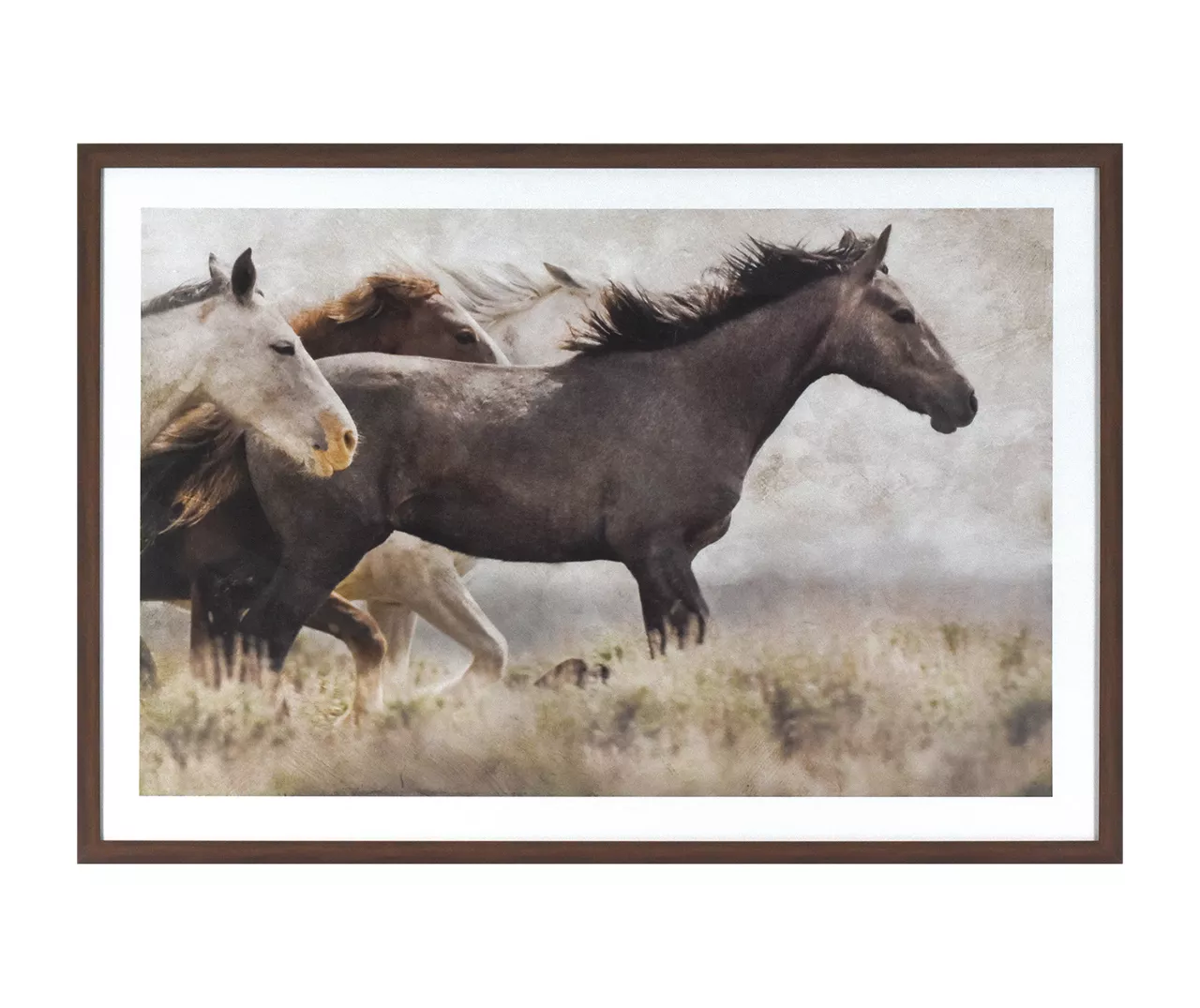 Add a wild spirit to your home decorating with this framed paper art. Four horses are captured galloping through a neutral field.