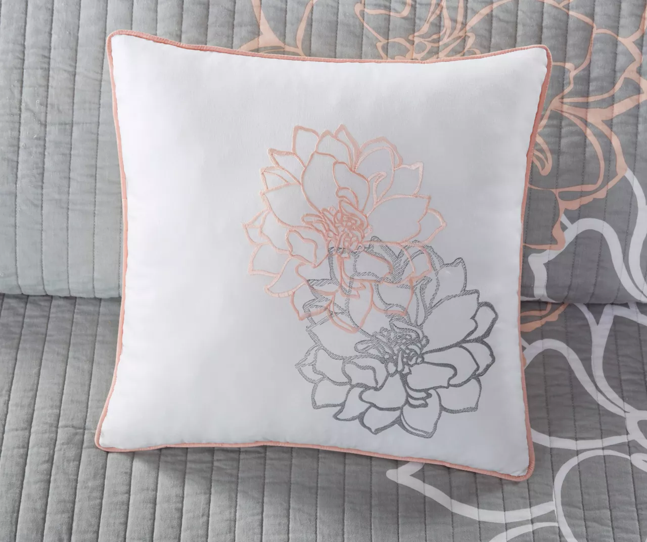 This printed coverlet set from the Jane collection brings beauty and grace to your bedroom. A large printed floral motif is displayed on the cotton coverlet and shams, for a chic transitional look. Three decorative pillows with embroidered details and fabric manipulation add dimension to the top of the bed. The coverlet features a printed design on one side that reverses to a solid hue on the other for twice the styling options.