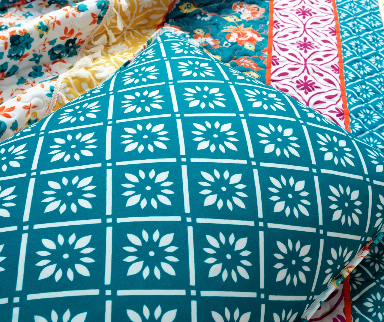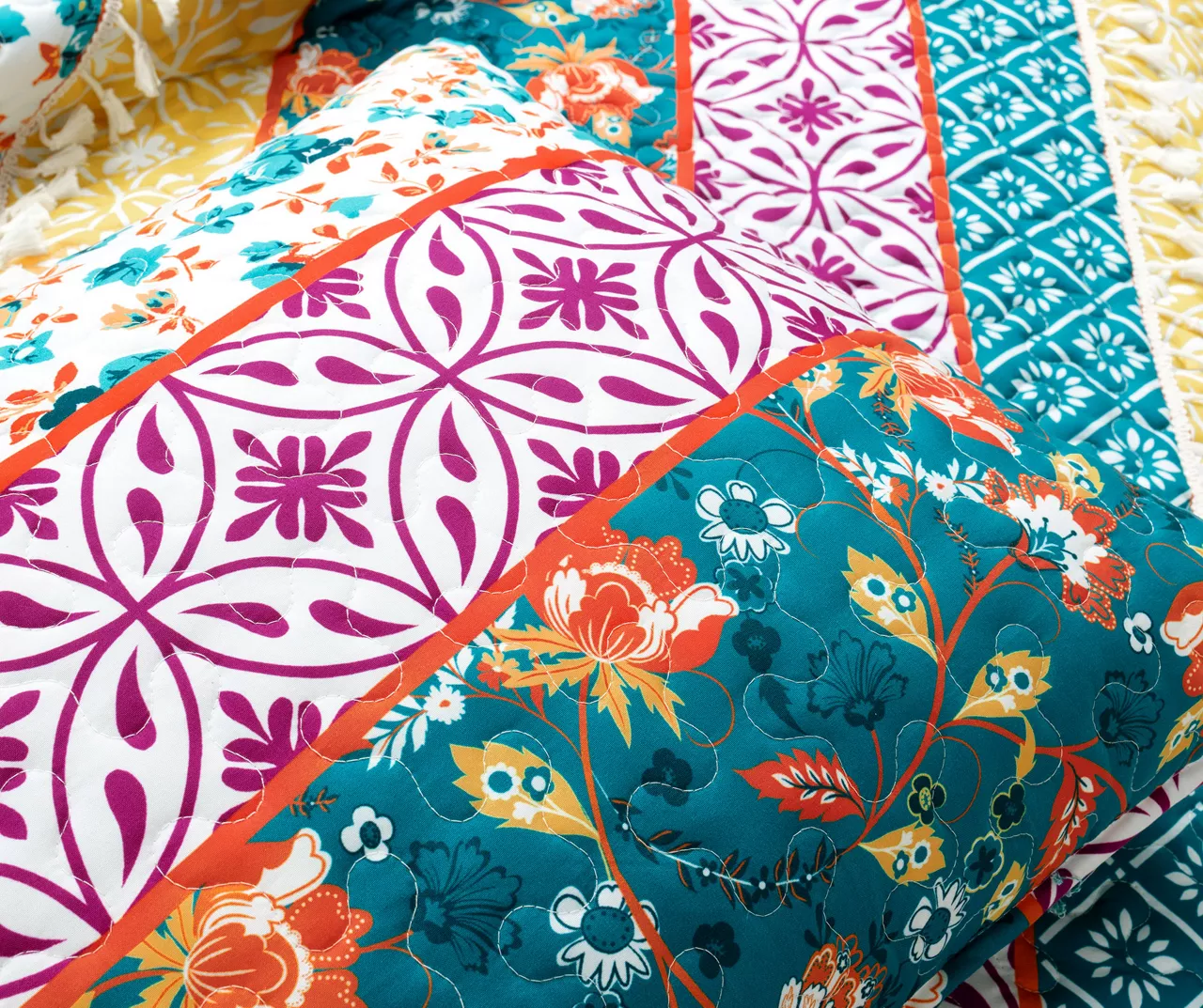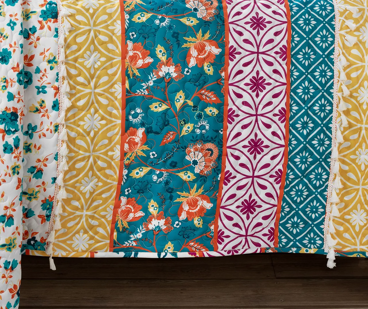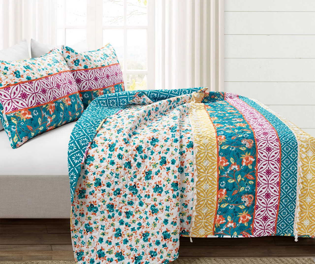 This artistic boho bedding from Lush Decor is for you maximalists! Each stripe block features fun and brightly colored flowers and shapes with added texture and visual interest from two rows of tassels. The quilt can be reversed to a diamond floral pattern for twice the styling options.