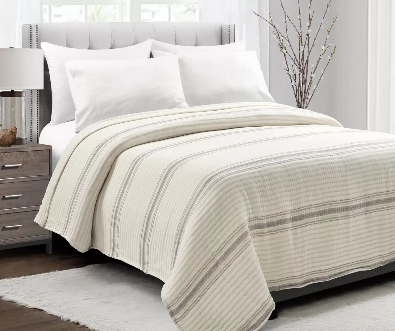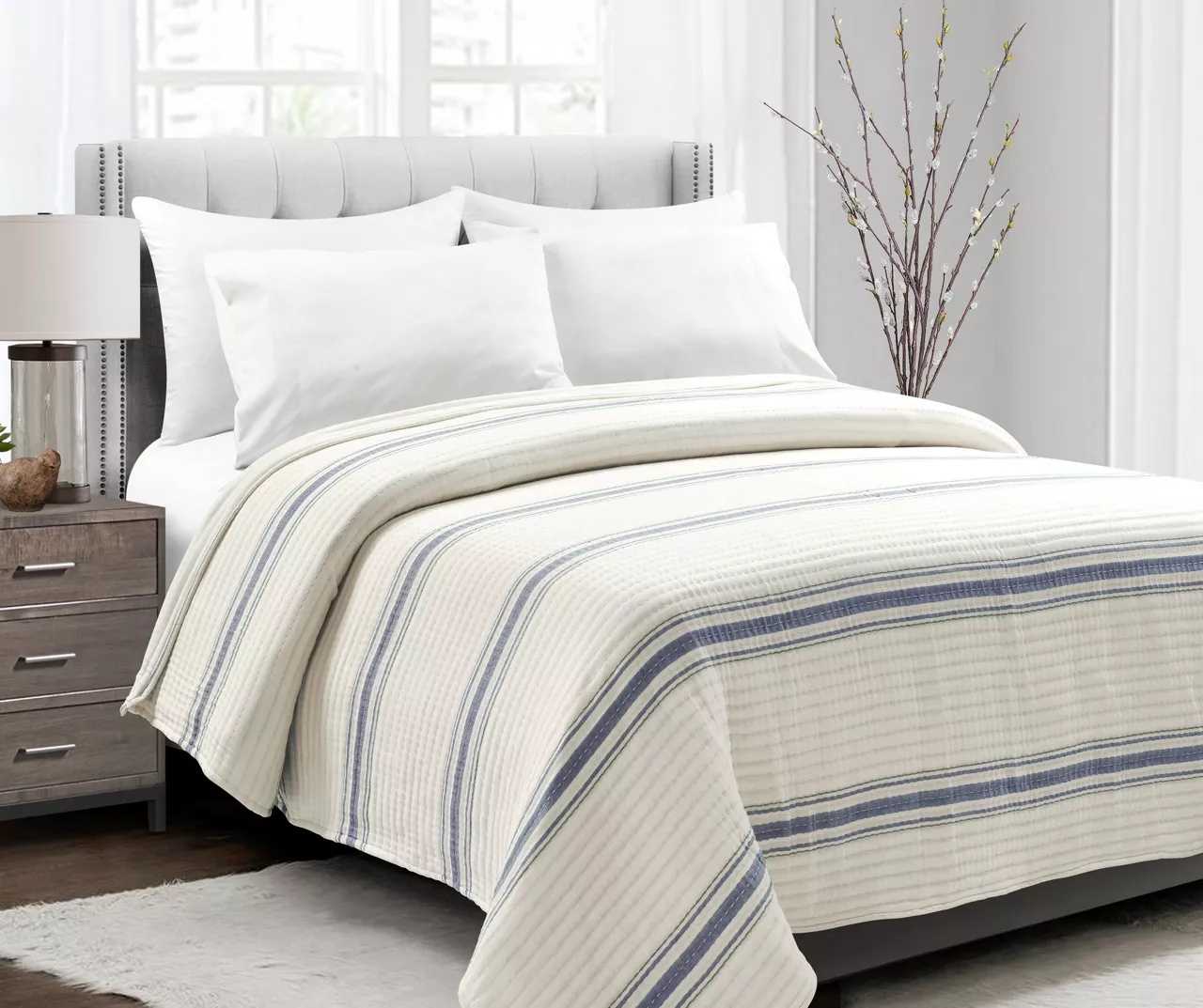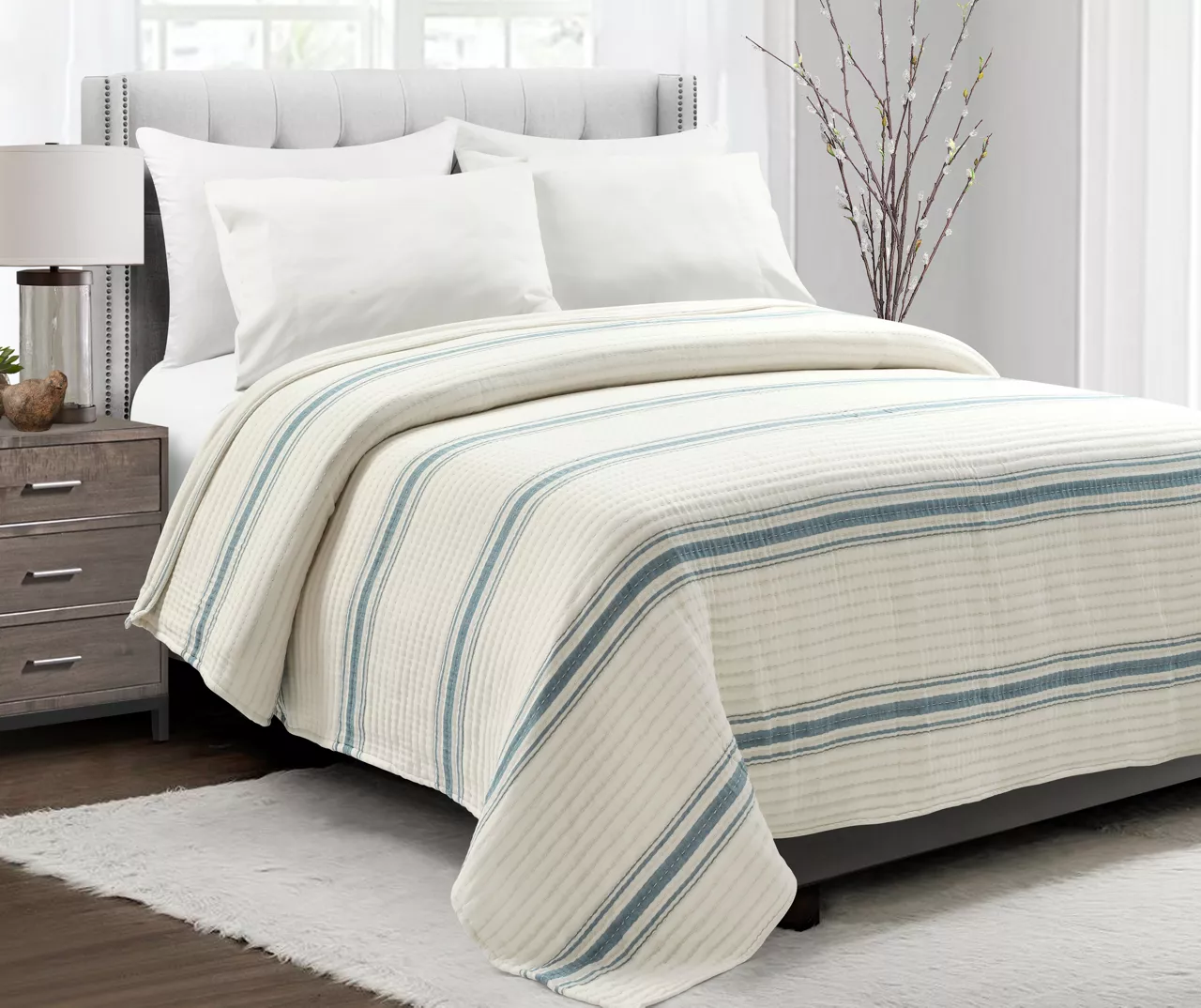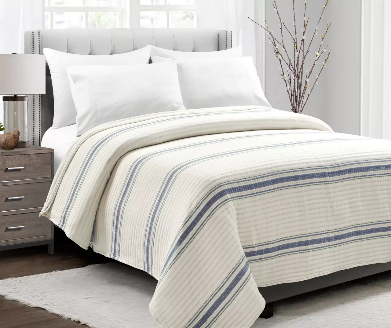 Classic stripes in blue bring farmhouse flair to this cream coverlet from Lush Decor, and horizontal quilting finishes the look with textured charm. The lightweight yet cozy design crafted from breathable cotton makes for a welcome top layer on cool nights.