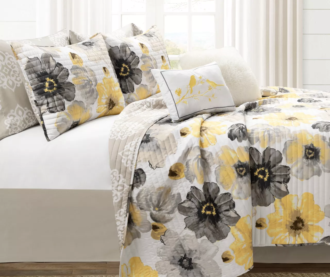 Bring the beauty of a botanical garden into your sleep space with the watercolor-style floral print of this reversible quilt set from Lush Decor featuring a soft damask pattern on the back. Complementary shams and decorative fuzzy and bird motif pillows complete the look with chic, contemporary flair.
