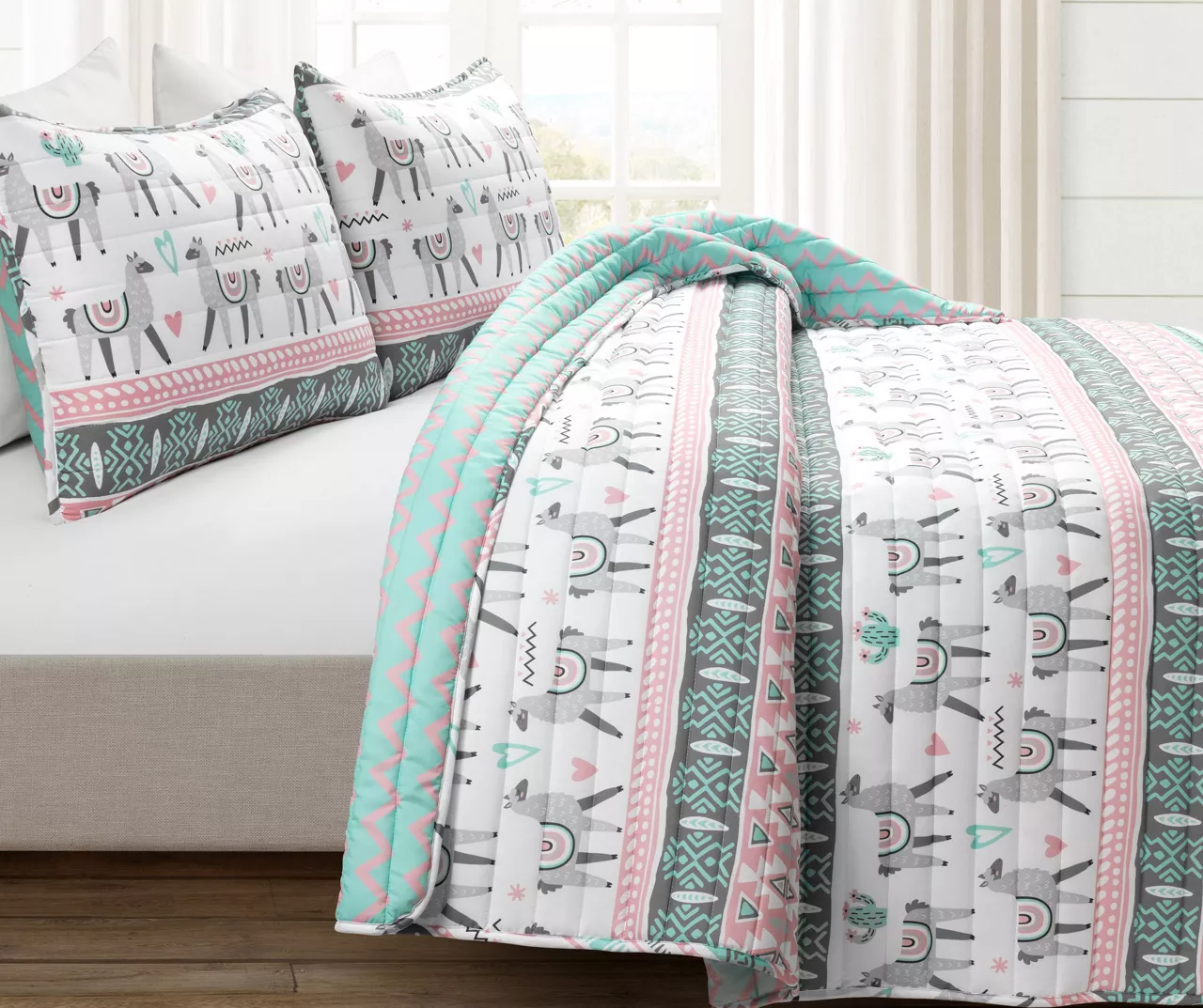 Adorable llamas and inspirational phrases define the front of this charming quilt set from Lush Decor. Oversized for your comfort, this quilt set will be the highlight of your guest or kiddo’s bedroom design. The quilt reverses to a bright zigzag pattern for twice the styling options.