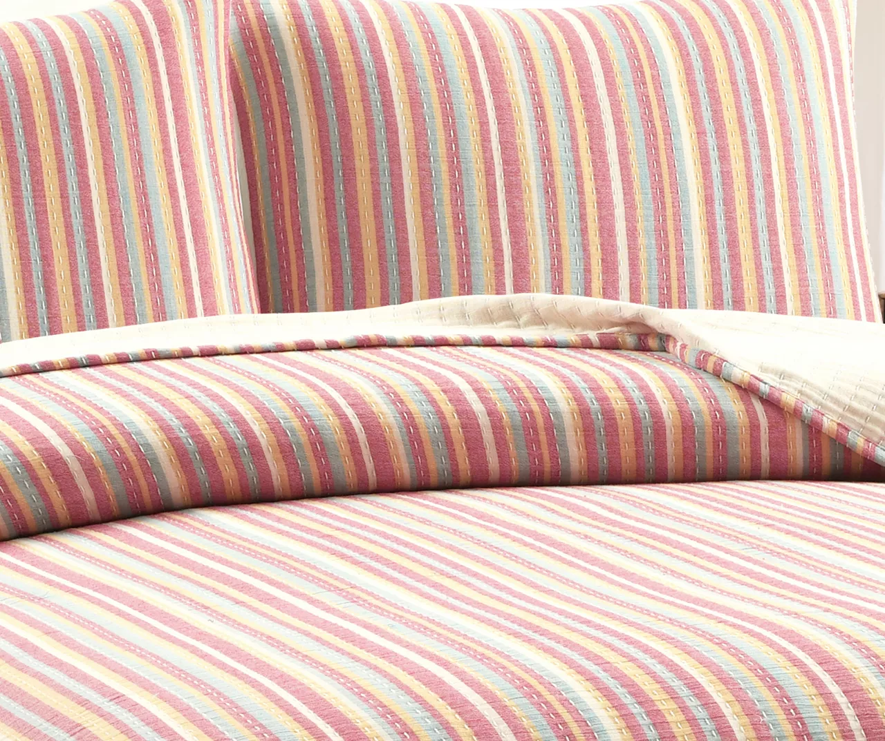 An eye-catching striped pattern takes beautiful cozy form on this yarn-dyed quilted coverlet set from Lush Decor. Breathable cotton fabric lends lasting comfort, and the lightweight yet cozy design makes this coverlet a great piece to use alone on warmer nights or as a layering piece on cooler nights.