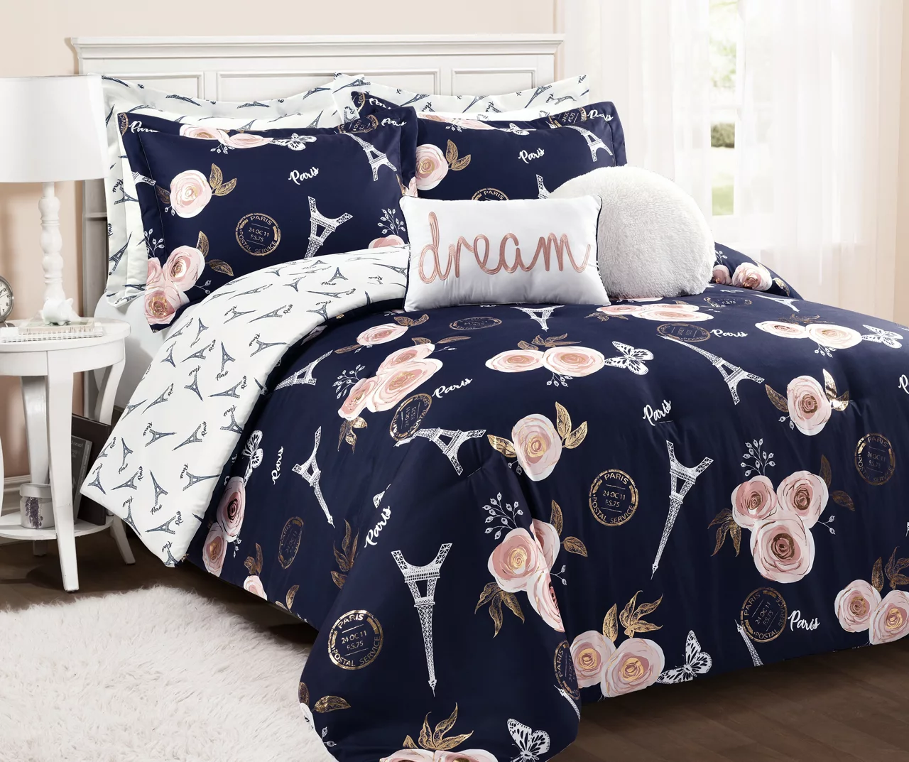Freshen your sleep space with a little Parisian romance through this botanical bedding set featuring a print of the Eiffel tower mixed in with soft pink blossoms and white contrast butterflies. Accent pillows add even more comfort that includes a fun faux fur round pillow and typographic rectangle pillow. The plush fabric is sure to keep you cozy through the night.