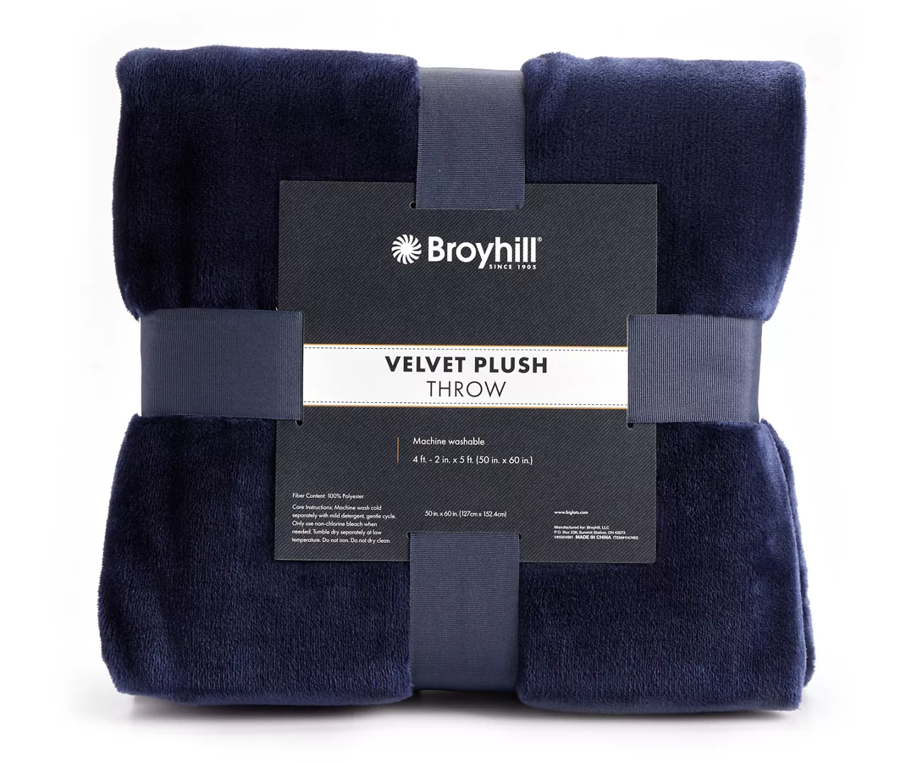 With so-soft velvety fabric in a versatile shade of navy, this throw from Broyhill delivers toasty warmth through chilly days and nights. It’s a cozy way to add a little extra flair to a bedroom, living room or home office.