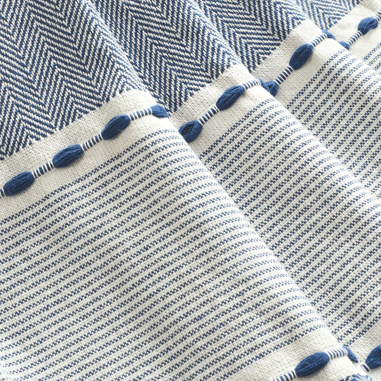 Style your living space or a bedroom with the free-spirited vibes of this cozy throw featuring lines of gathered threads amongst herringbone print and stripes. Tassels adorn each end for some playful panache and added boho charm.