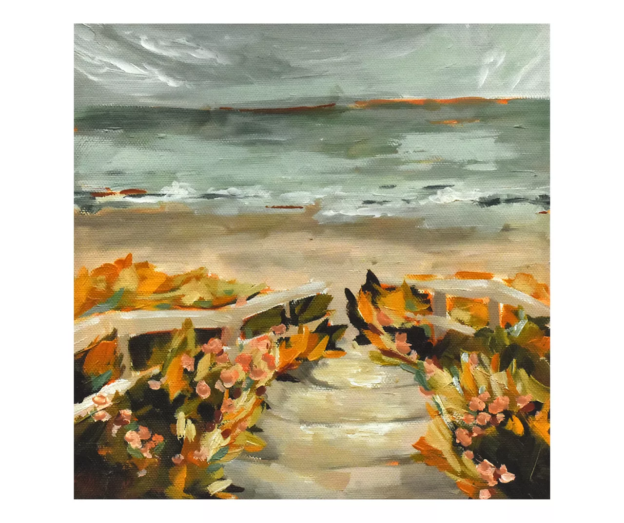 This art canvas is reminiscent of a day at the shore. The painterly illustration captures a pathway down to the beach that’s surrounded by light pink tulips and orange leaves.