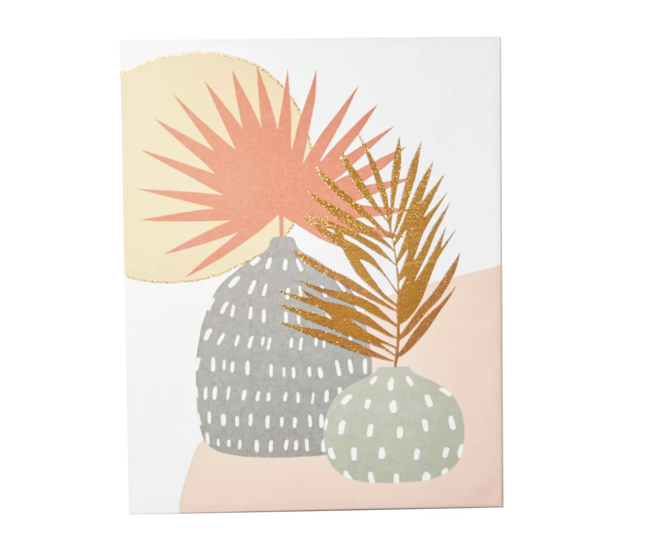 Expand your home gallery or bring a contemporary flourish to a blank spot on your walls with the addition of this gallery-wrapped canvas that comes ready to hang and features a modern vase and leaf design in warm peach and green hues with goldtone accents.