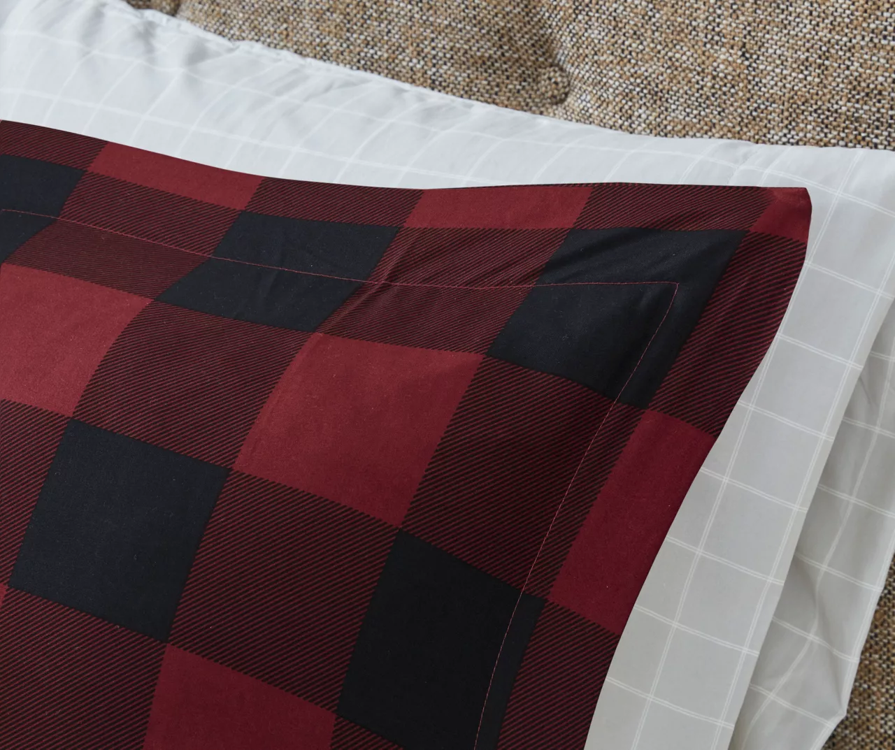 The Rochester 8-Piece Reversible Complete Bedding Set brings a cozy cabin allure to your bedroom decor. A red and black buffalo check print adorns the front of the ultra-soft microfiber comforter, for a rustic lodge look. On the reverse, a smaller checker pattern in a coordinating color scheme complements the top of the bed, while matching shams complete the reversible comforter set. A square decorative pillow with embroidery and button details and a solid black bed skirt add the finishing touches. This complete bedding set is OEKO-TEX certified, meaning it has no harmful substances or chemicals ensuring quality comfort and wellness. Bringing the best in health and wellness, this bedding set also features an anti-microbial treatment that provides built-in freshness protection, reducing the growth of odor causing bacteria and keeps fabric lasting longer.