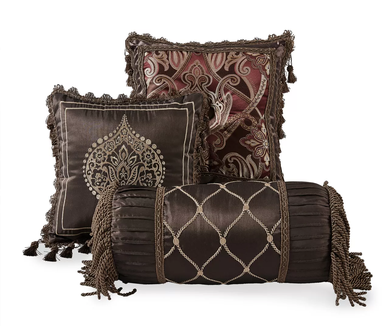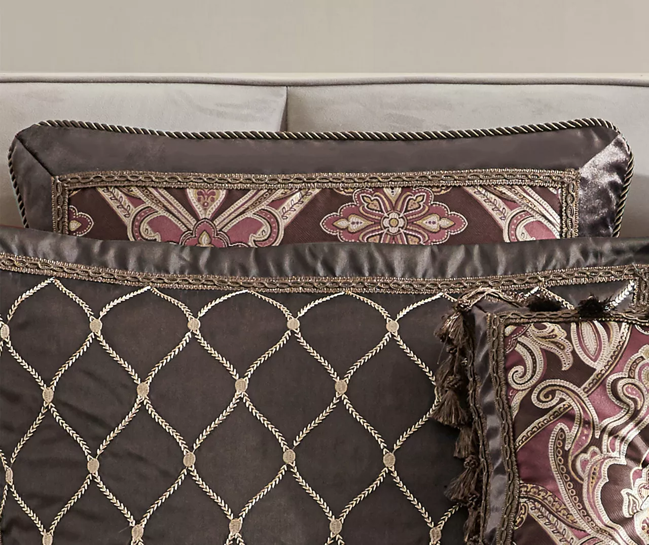- Decorative pillows feature jacquard, embroidery, pleats, braided trim and tassels