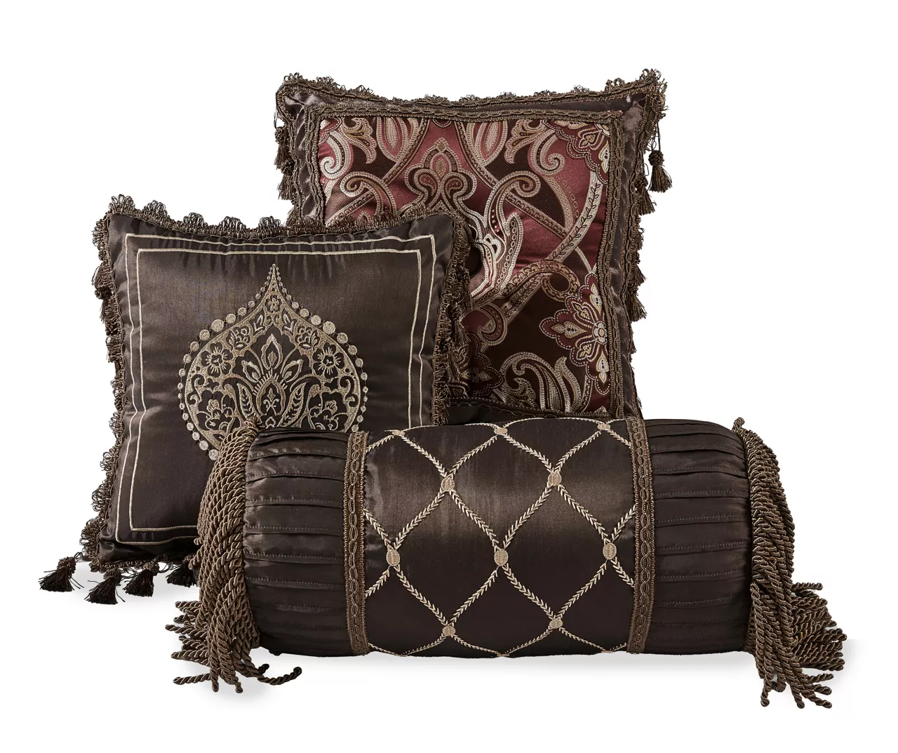 Decadence defines this cozy comforter set featuring a paisley print with corded arabesque accents and a braided trim, which is mirrored in the matching shams. The decorative pillows feature tassels and cording flourishes for the ultimate look of luxury. A matching bedskirt finishes the look.