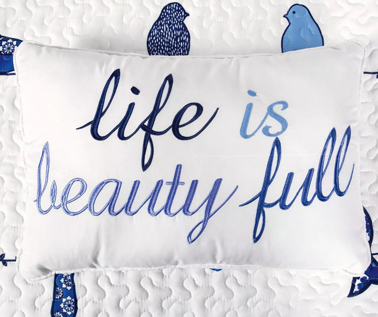 - Decorative pillows feature a “life is beauty full” sentiment and patterned design