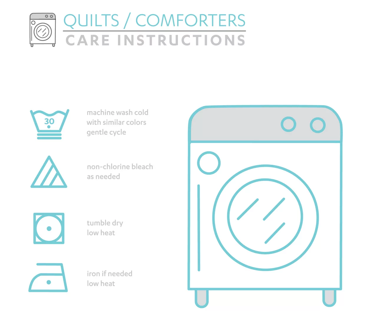 - Machine wash cold, similar colors. Gentle cycle. Use only non-chlorine bleach when needed. Tumble dry low. Light iron if needed