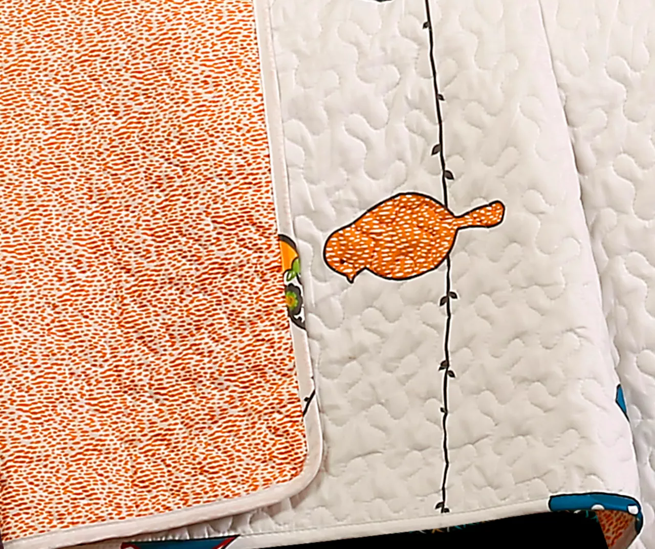 - Reversible quilt features a bird design on one side and dotted pattern on the reverse