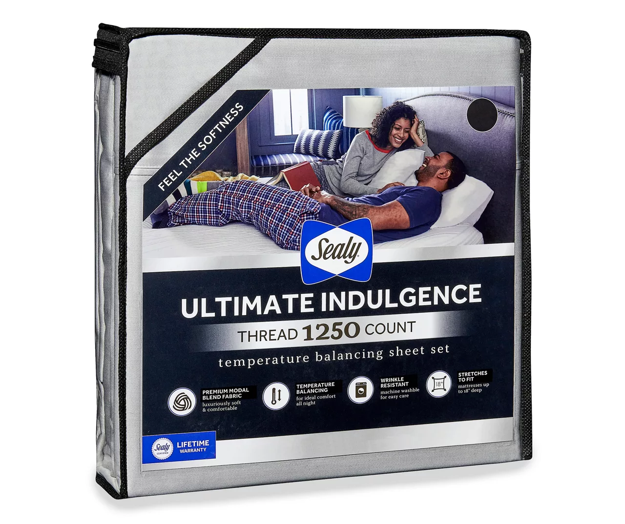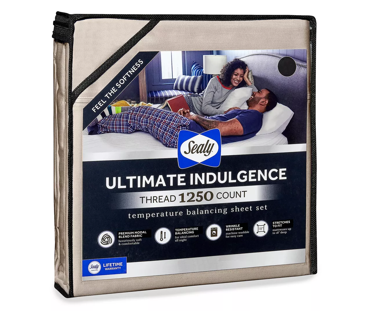 The Sealy Ultimate Indulgence sheet set is a premium 1250 thread count, modal blend fabric that offers a temperature balancing technology that adjusts to your body temperature to keep you comfortable all night. Generous fit sides can accommodate mattresses up to 18 inches deep and won’t pop off. This set is machine washable and wrinkle resistant for easy care.