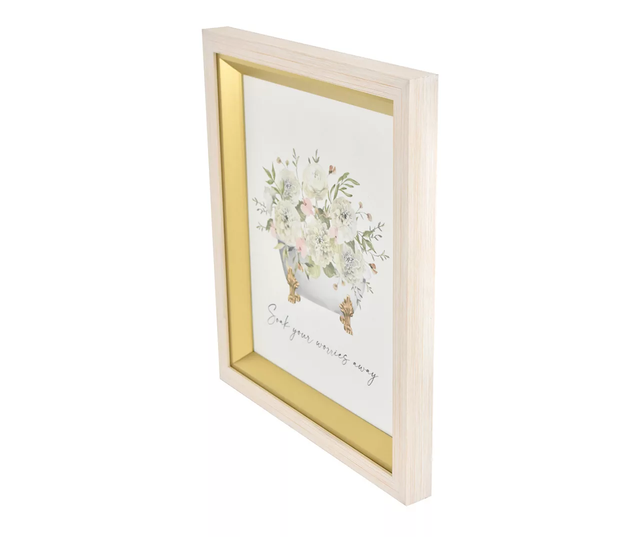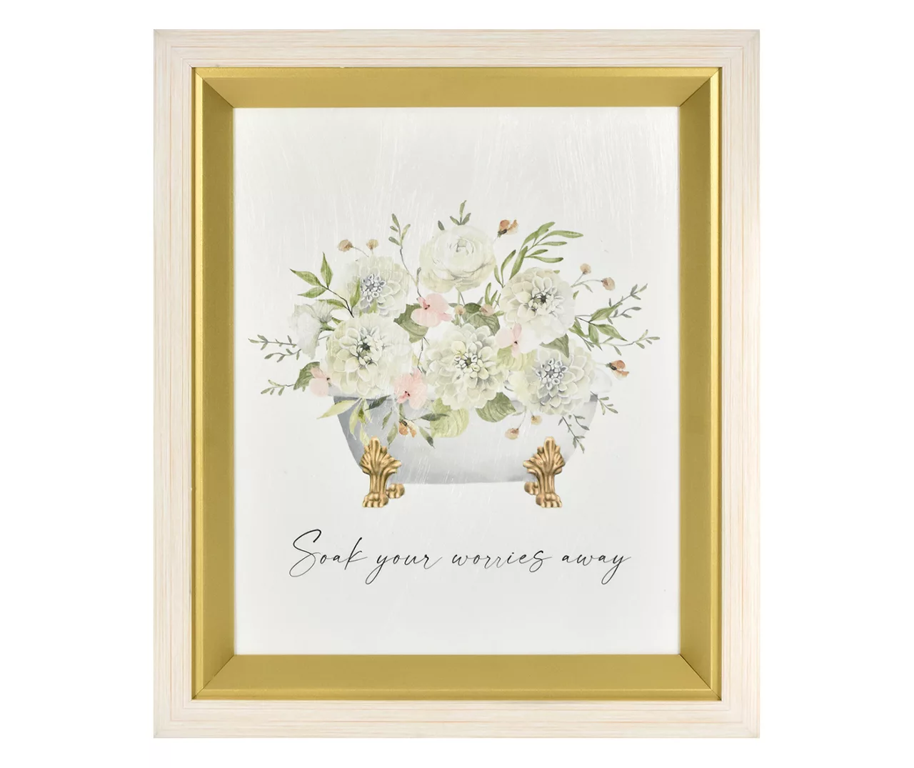 Create an elegant look for your bathroom decorating with this framed art. “Soak Your Worries Away” is written sentimentally below a Victorian bathtub illustration filled with flowers.
