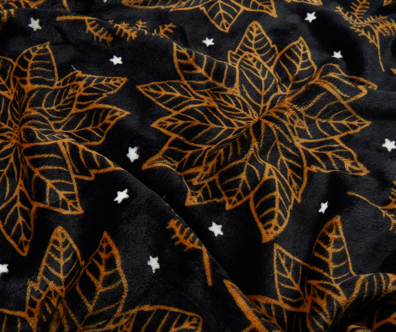 Stay warm and comfy whether it’s film night or you’re diving into a new book with this soft and cozy Thalia throw. The plush material is printed with a festive poinsettia pattern in gold on black for a merry accent in a bedroom or living room.
