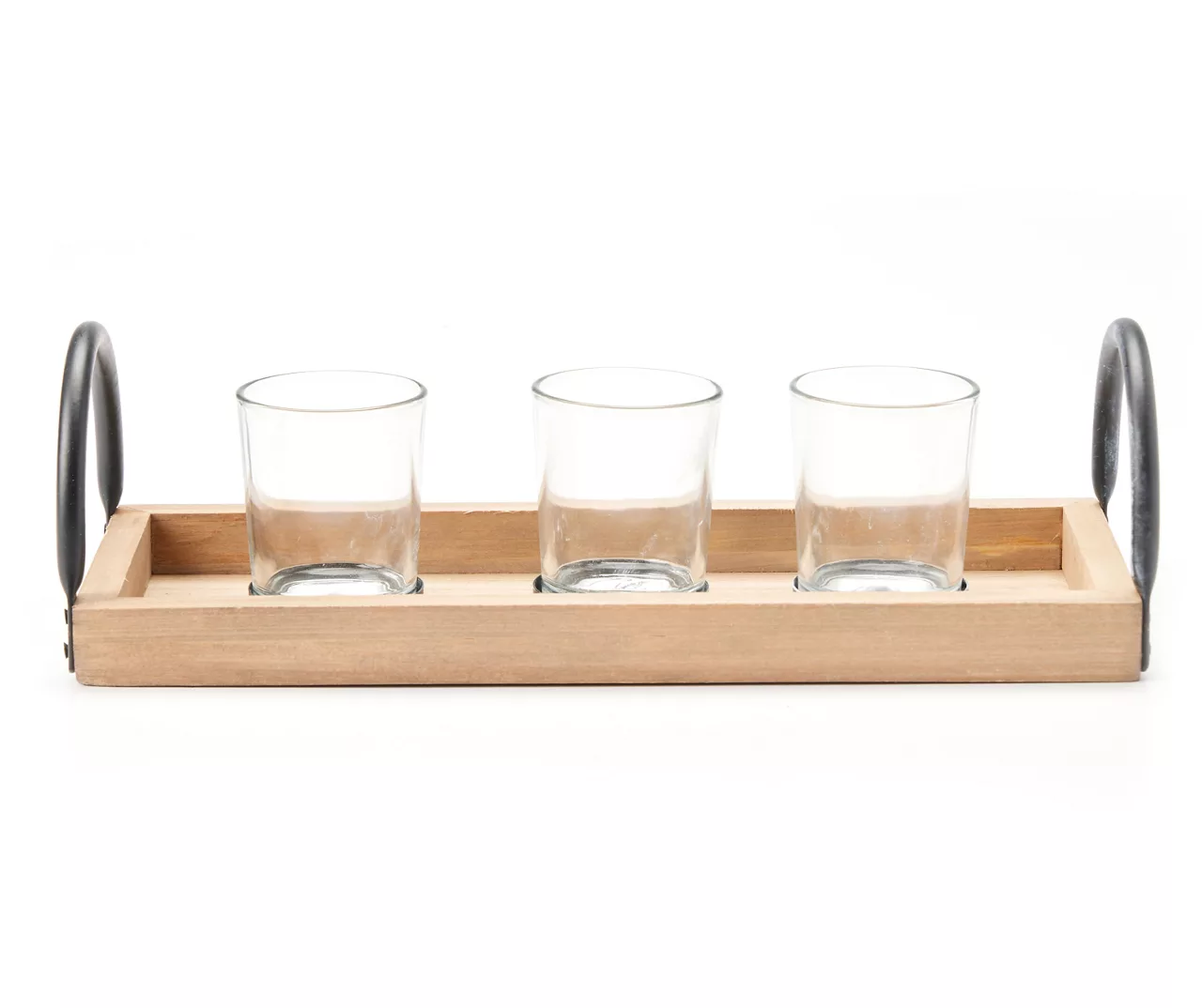 Create an inviting centerpiece on a dining table, coffee table or mantel with this lovely votive holder featuring three glass jars on a wooden base with metal handles. The neutral palette makes it easy to complement and coordinate with your exisiting décor.