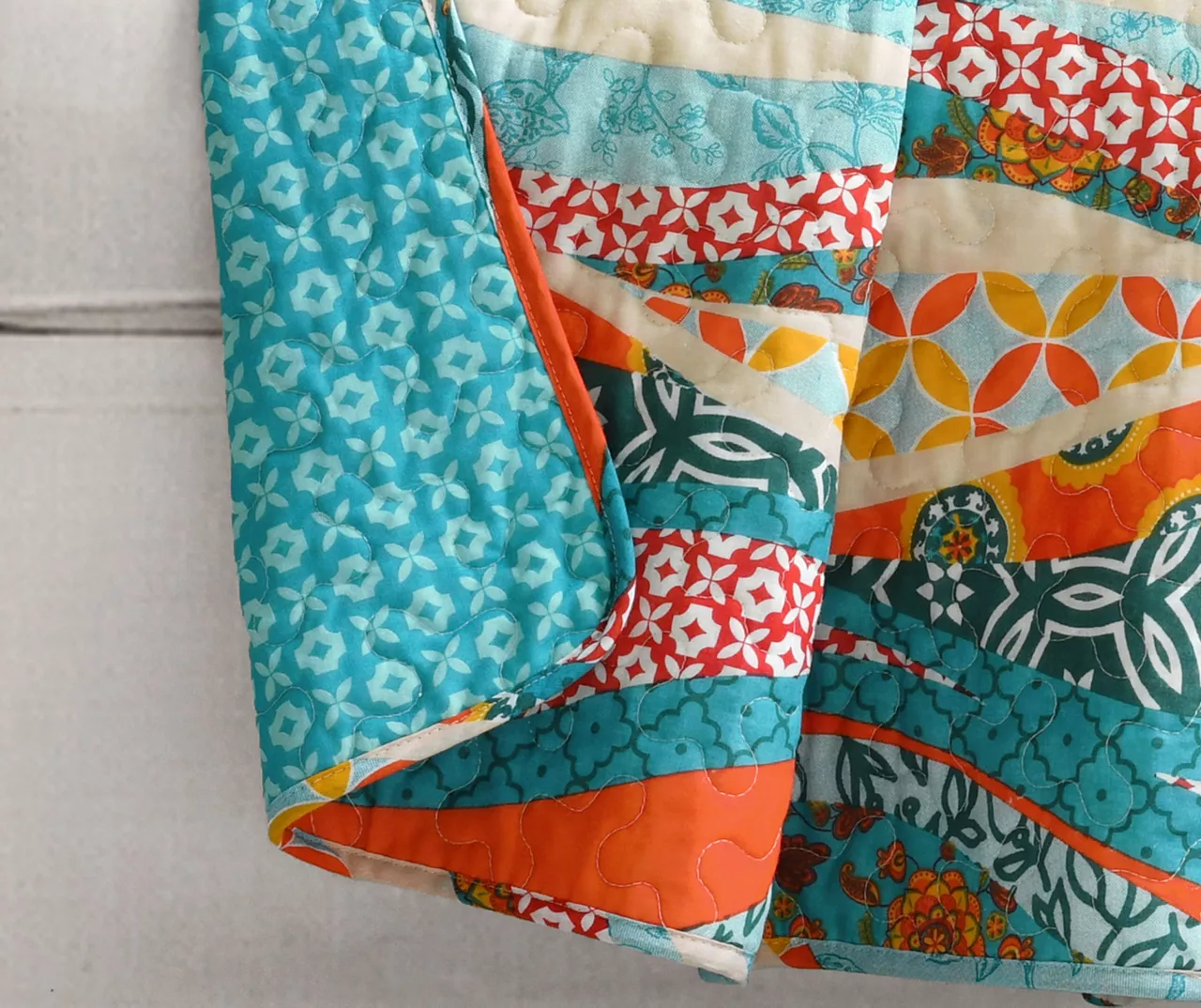 Waves of patterns bring boho appeal and colorful contemporary style to this quilted throw that keeps you cozy under breathable cotton fabric, for a home accent full of eclectic appeal.