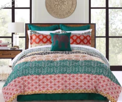Beautify the bedroom with boho vibes when you add this plush and cozy bedding set featuring an eclectic mix of prints and patterns arranged in a color block design in bright turquose and red hues. A matching decorative pillow flaunts an embroidered elephant design for a dash of safari style.