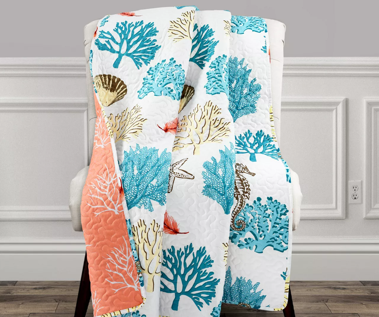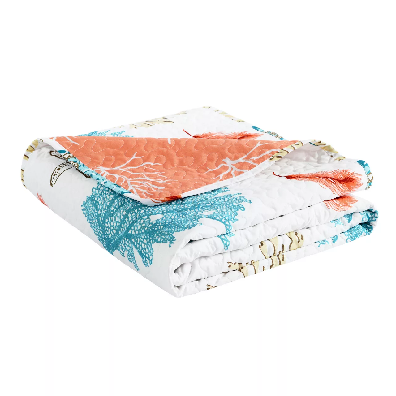 Style your living space with the soothing sea vibes and cozy comfort of this quilted throw decked out in a coral and ocean creature pattern in bright white and deep blue hues. A coral pink reverse side provides a pop of bright contrast for modern style that stands out.