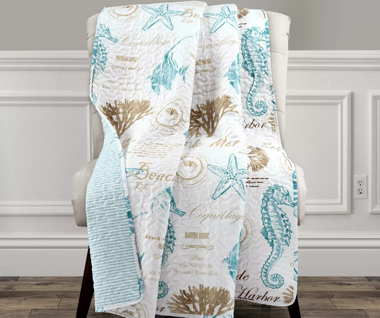 Soothing sea vibes await when you add this quilted throw to your space for a spot of cozy comfort that’s decked out in typographic accents and oceanic designs. Polyester fabric is sure to keep you warm on cool days and evenings.