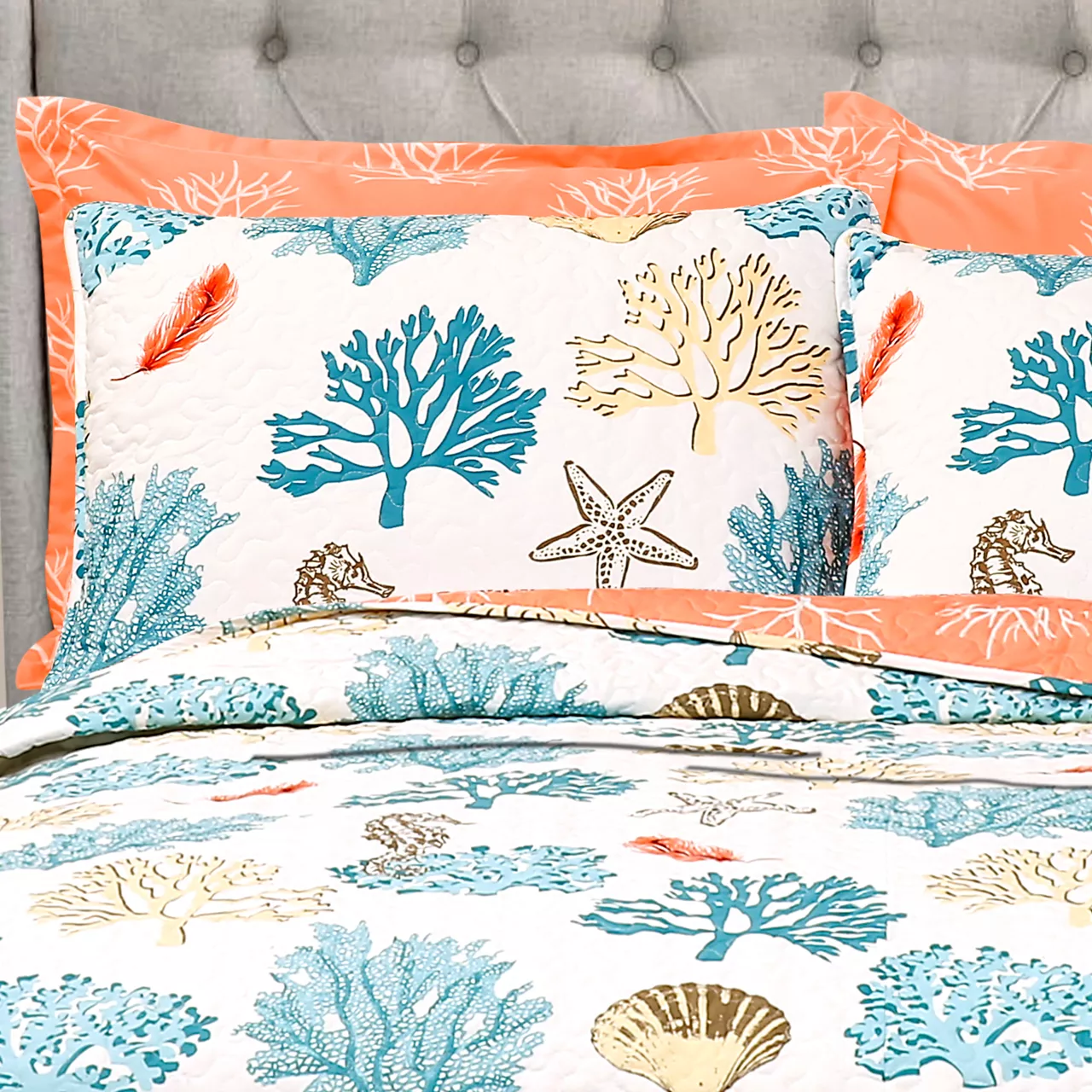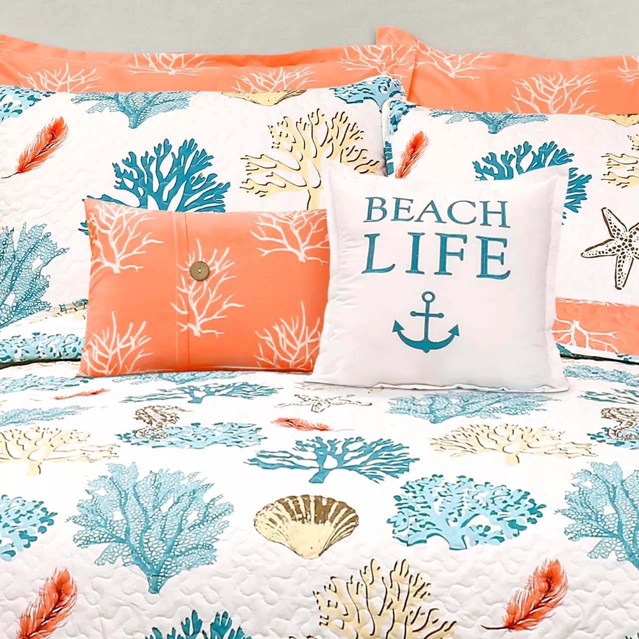 Turn your bedroom into a sea-worthy escape with the coastal charm of this quilt set featuring a print design filled with coral formations, starfish and feathers. Coordinating decorative pillows complement the look with a button embellishment and a typographic design. Soft polyester keeps you cozy and comfy through the night.