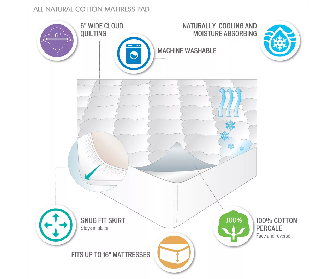 - 1 Mattress Pad:72″W x 84″L + 12″D