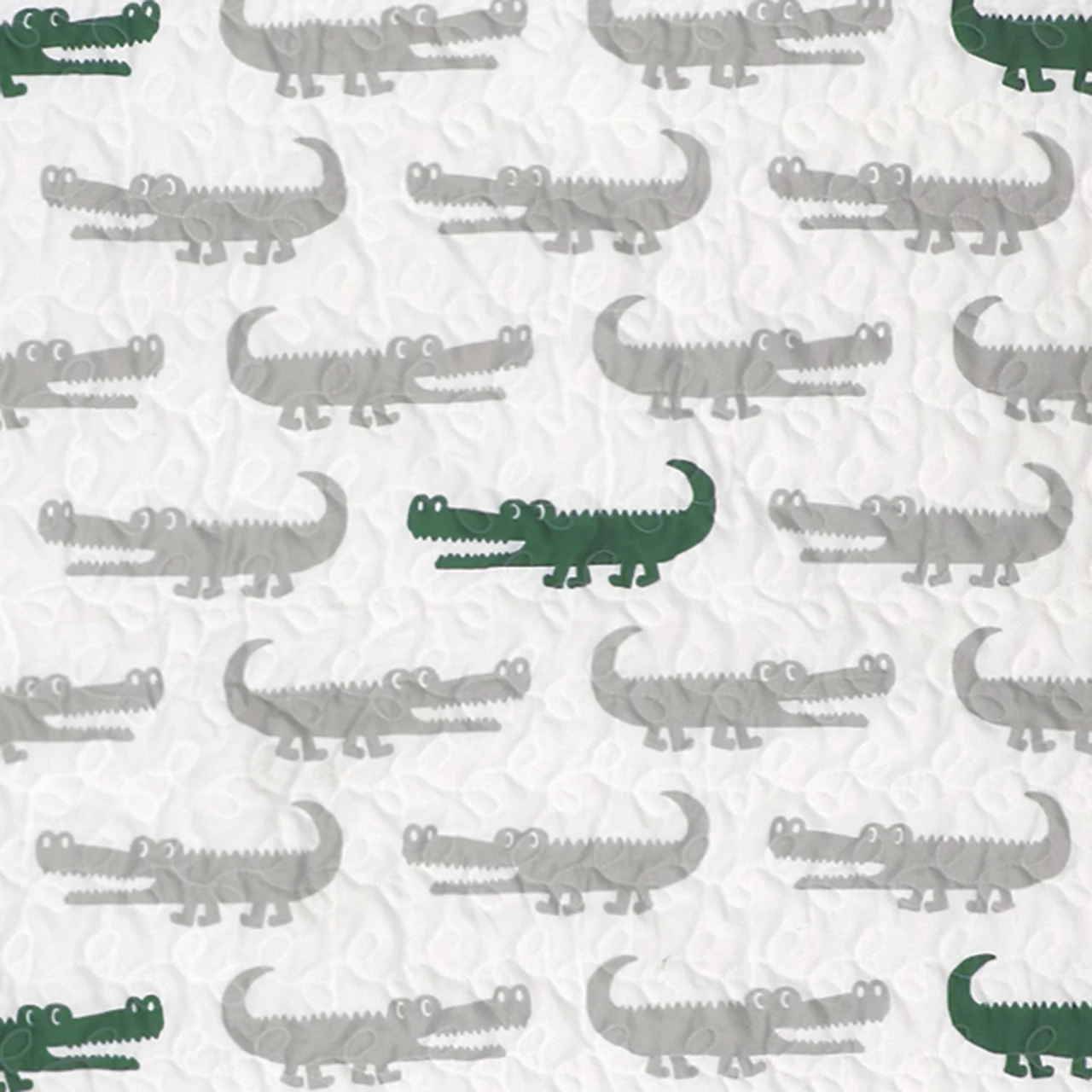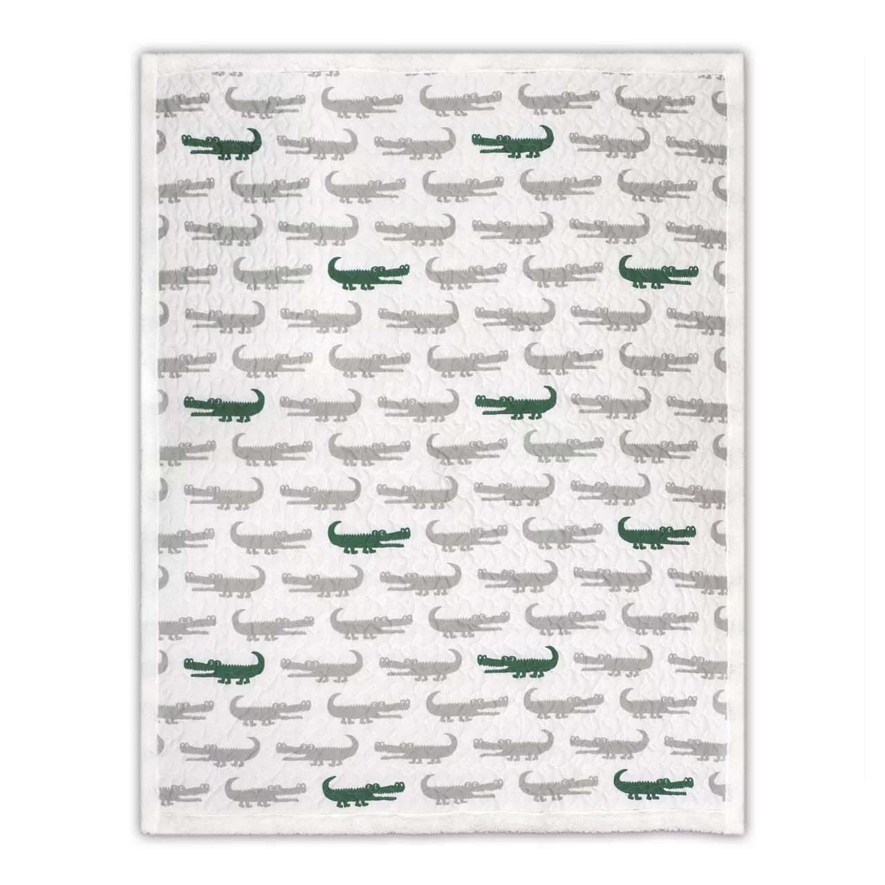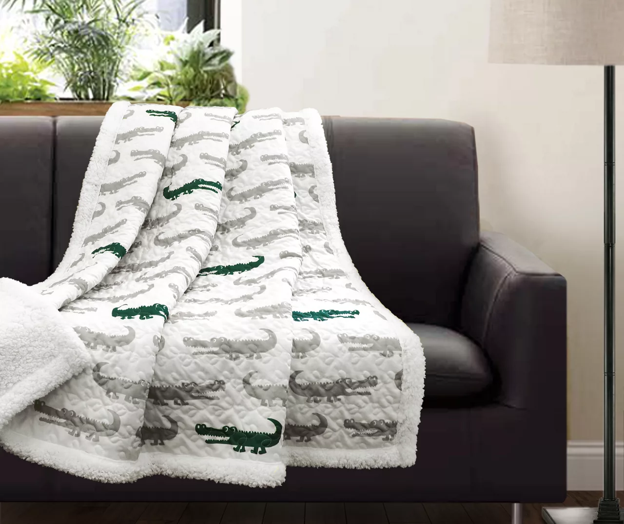 Transform your space with the critter-themed charm and cozy comfort of this quilted throw. It features a sweet green and gray alligator pattern, while soft sherpa on the trim and reverse side is sure to keep you warm.