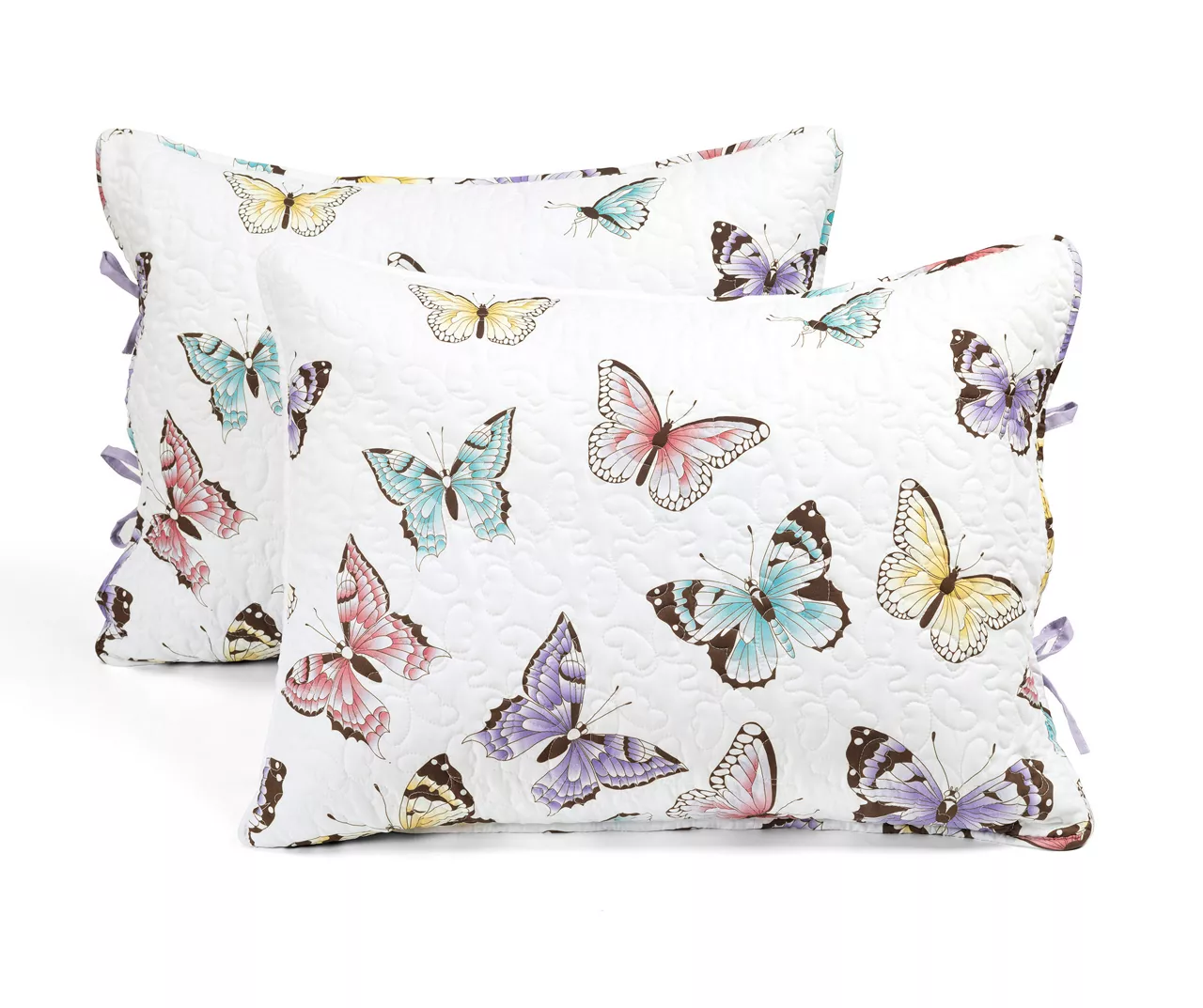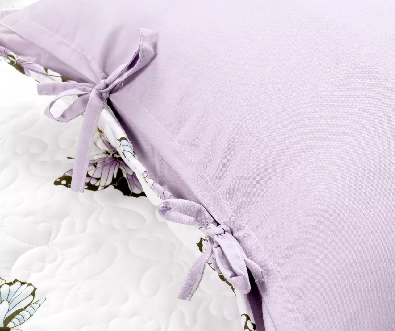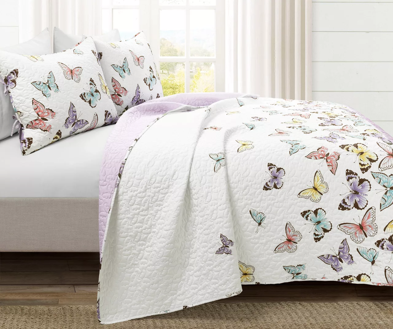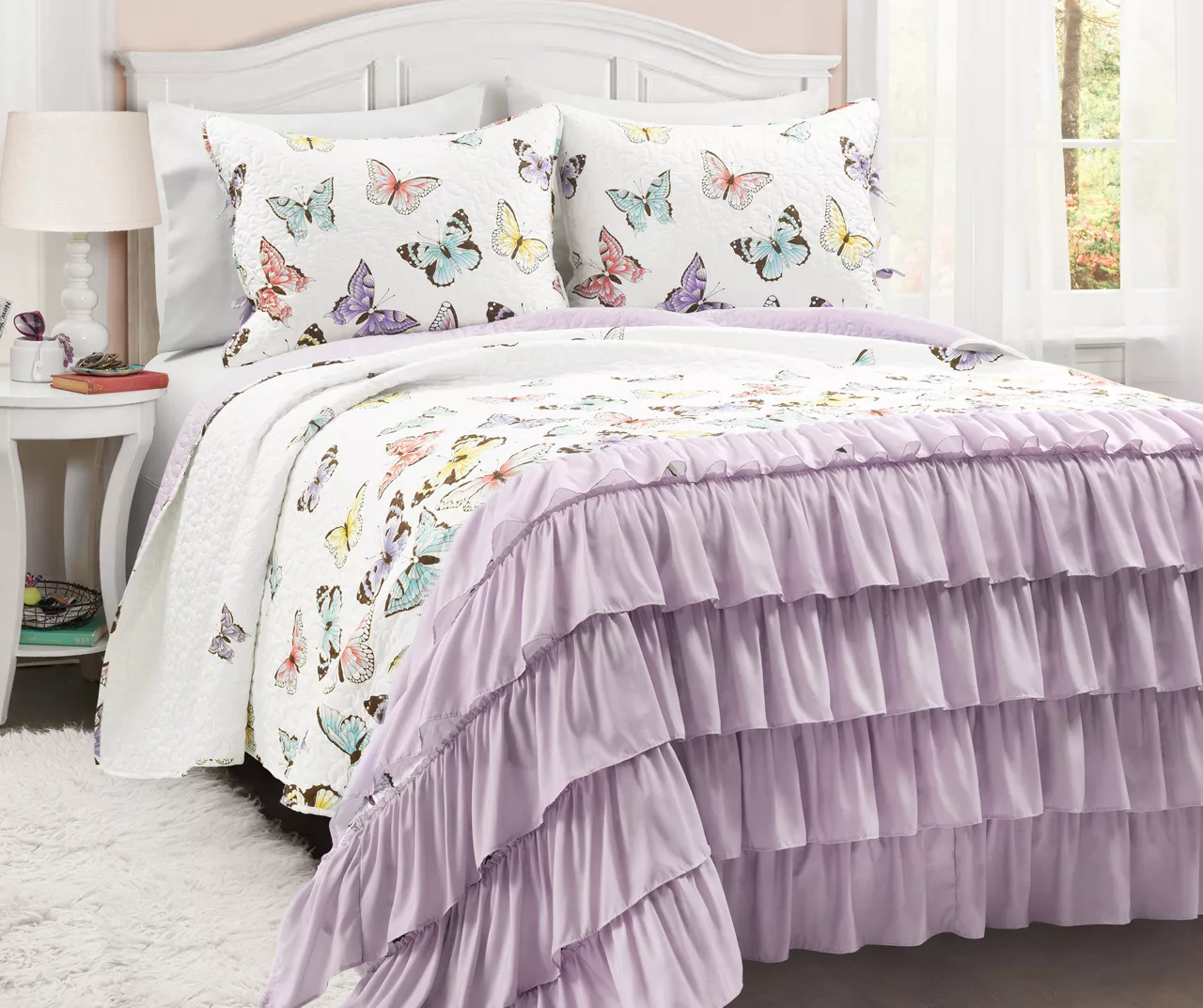 Dancing pastel butterflies float above playful lilac ruffles on this elegant quilt set for a feminine bedroom look that’s sure to stand out. Matching shams complete the look with darling purple ties along the sides, and a reversible quilt offers twice the styling options.