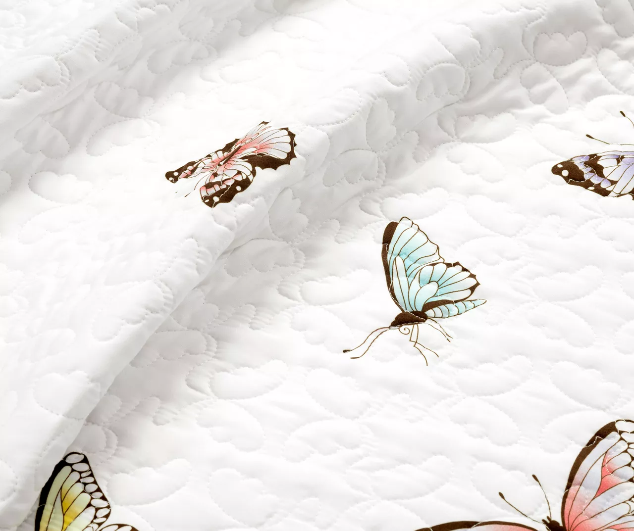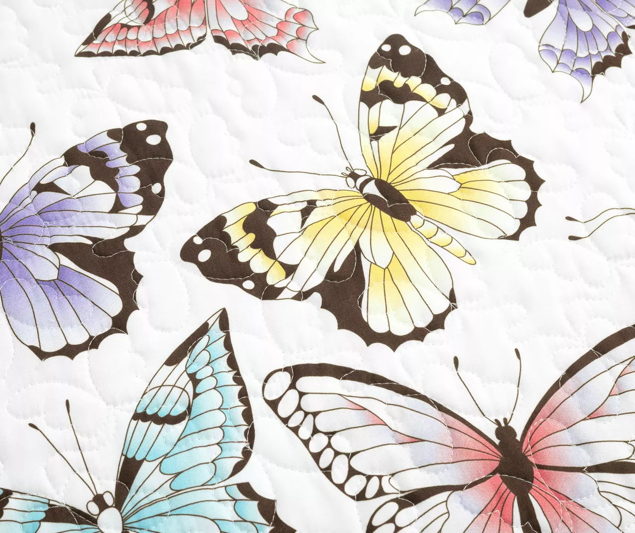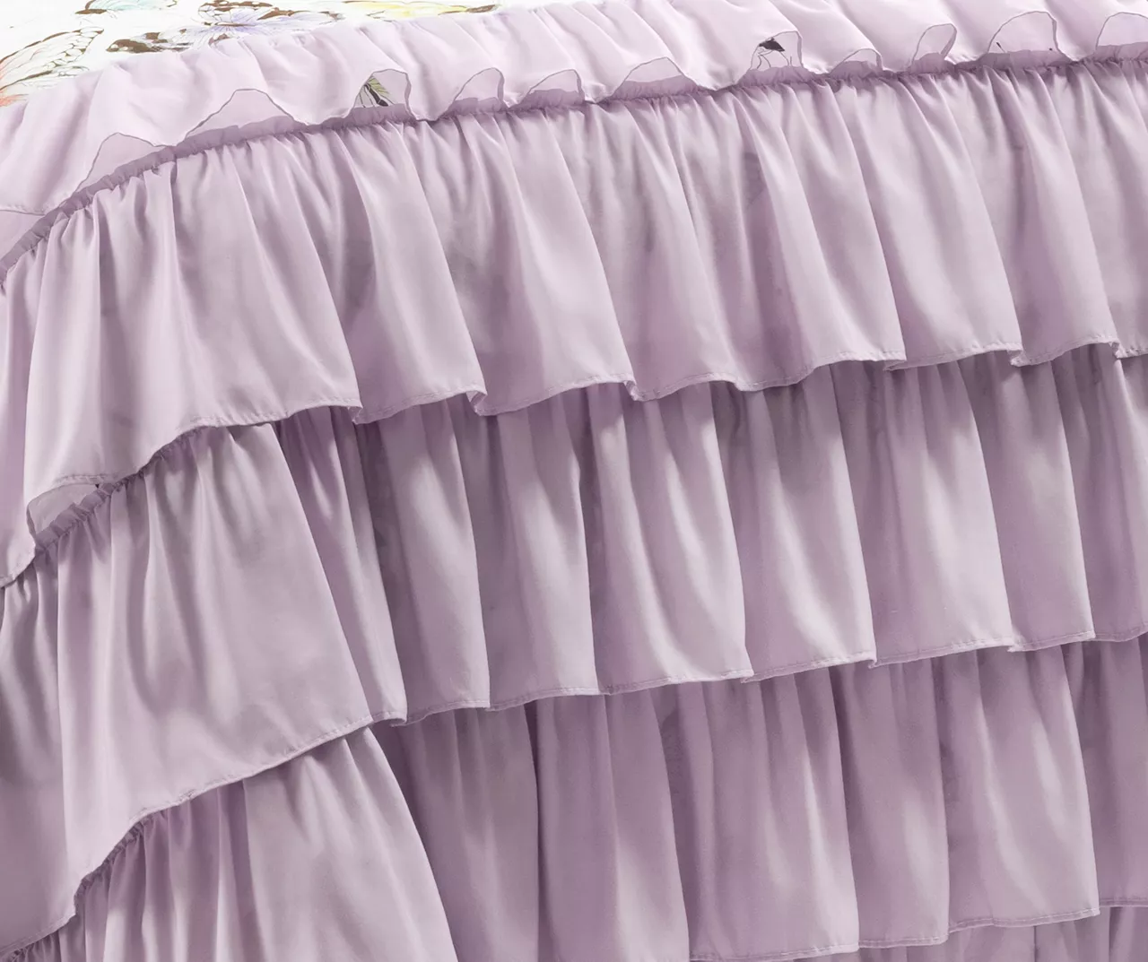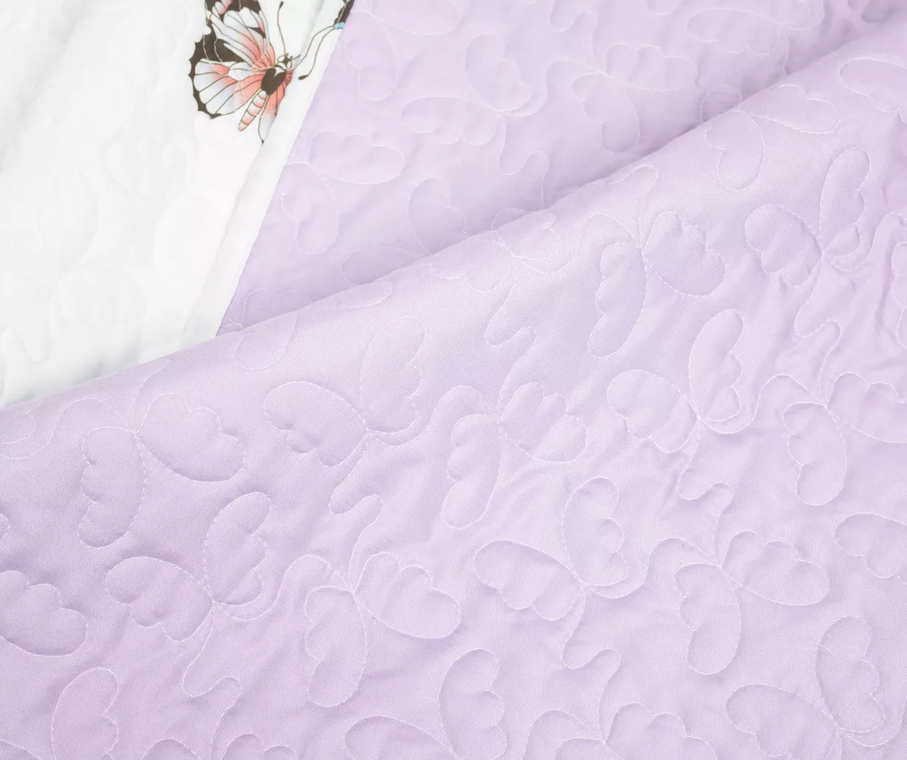 Dancing pastel butterflies float above playful lilac ruffles on this elegant quilt set for a feminine bedroom look that’s sure to stand out. Matching shams complete the look with darling purple ties along the sides, and a reversible quilt offers twice the styling options.