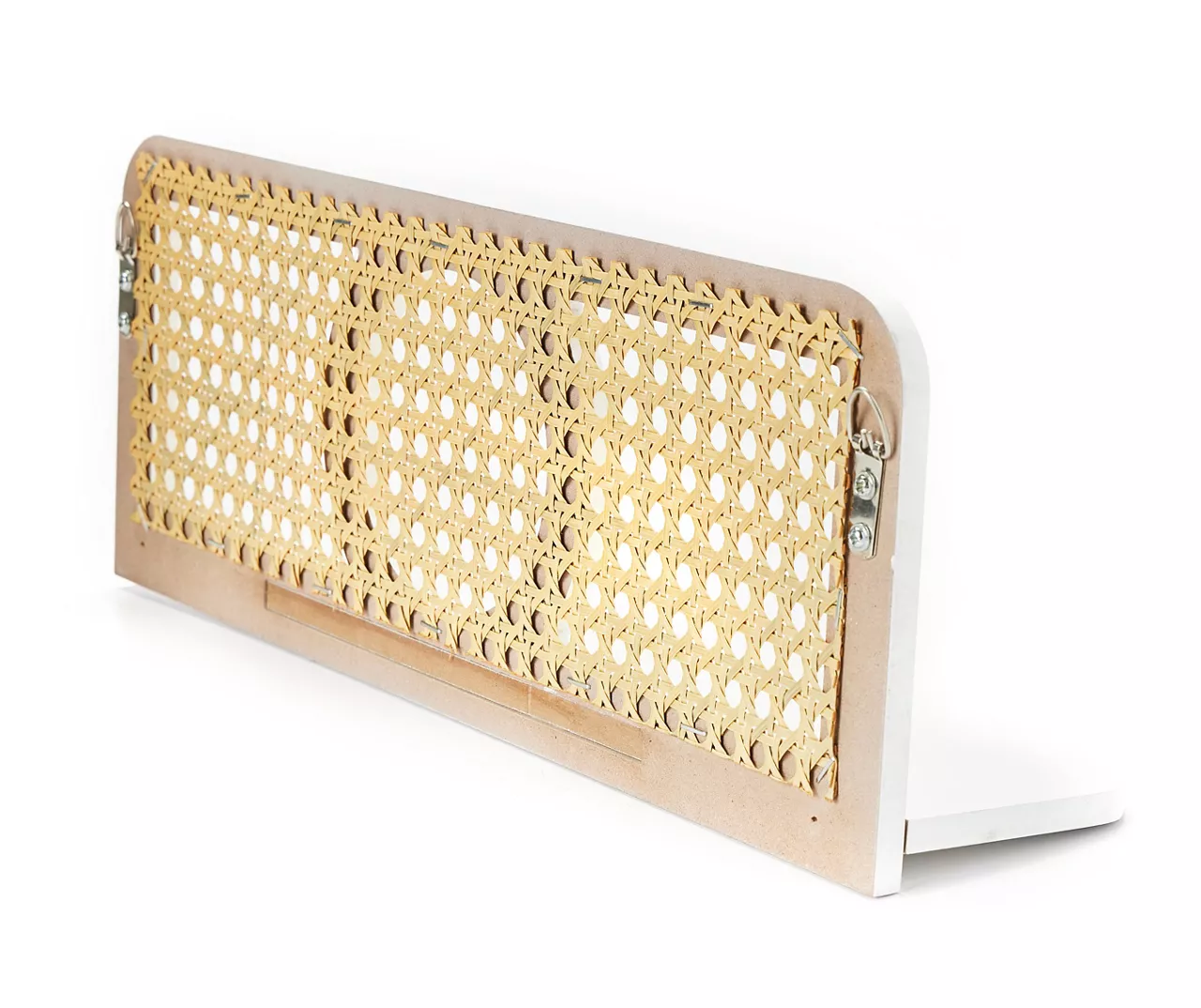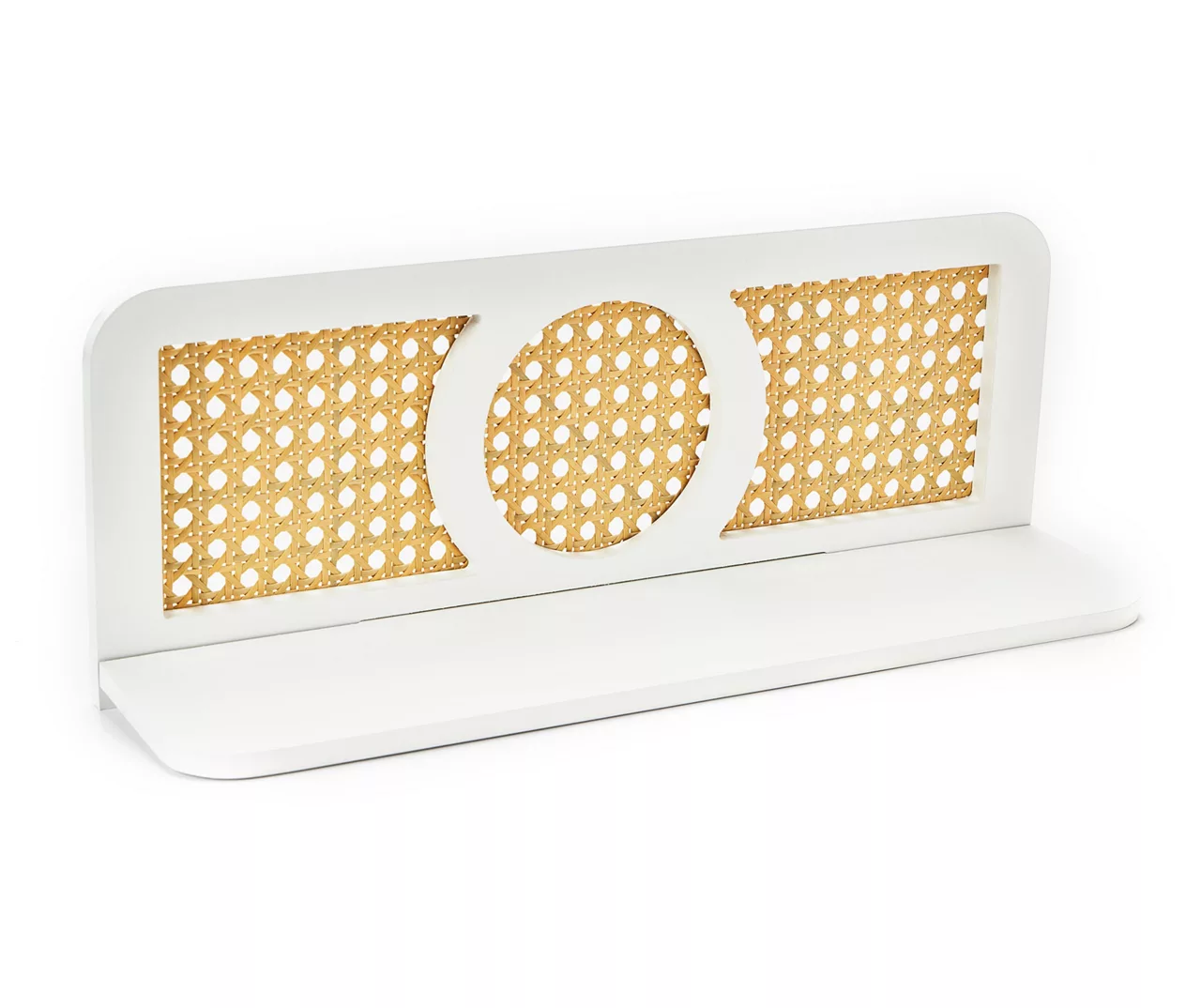This wall shelf brings a decorative and nautical look to your favorite treasures. A white frame features a backer with cut outs for displaying a woven plastic rattan weave. This shelf is a charming addition to a living space, hallway or entryway.